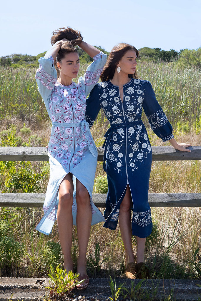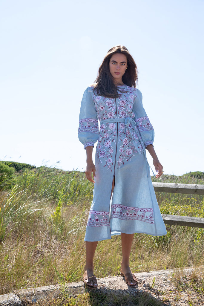 Inspired by art, architecture, and the founder’s global journeys, ASHA by Ashley McCormick introduces bold, sophisticated jewelry and accessories made from only the finest materials. From everyday glamour to the red carpet, these statement pieces are classic additions to your collection. The Chambray Blythe Belted Dress is a study in bohemian elegance, cut from light blue linen with a belted silhouette that flatters and moves with ease. Voluminous sleeves and a softly flared skirt are framed by intricate vine-like embroidery across the bodice, while swirling paisleys in burgundy trace the cuffs and hem.