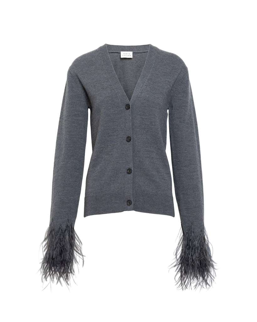 The Charlotte Feather Cardigan in Dark Heather Gray offers a playful yet polished take on the classic knit. Crafted from extra-fine merino wool, this versatile cardigan features a button-front V-neckline and feather-trimmed cuffs that bring a touch of festive flair. Designed to be worn open or closed, Charlotte delivers cozy sophistication for day-to-night dressing.