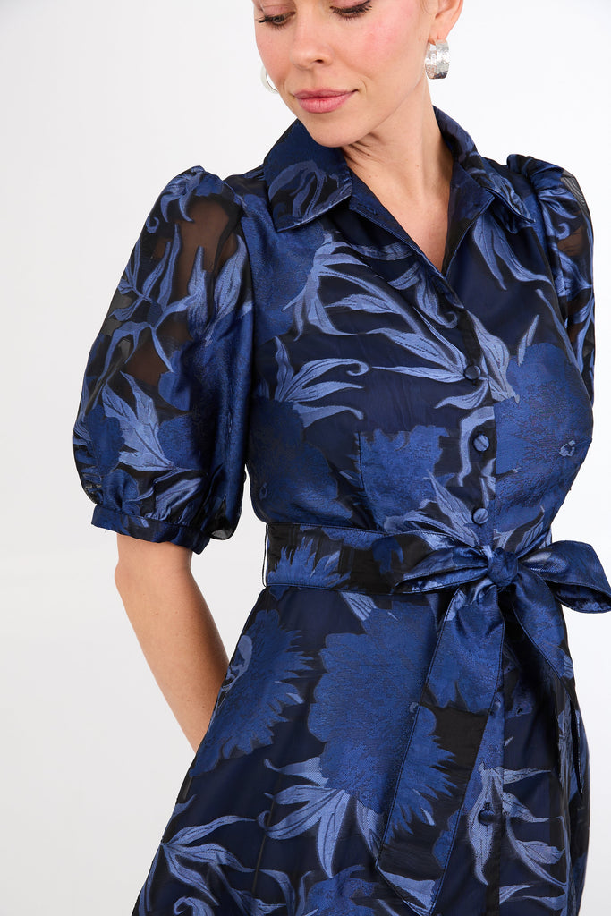 Organza. 80% polyester, 20% nylon. Collared neckline. Short sleeves with gathered cuff detail. Removable self-tie belt. Front closure with covered buttons. A-line silhouette. Fully lined, except for sleeves.