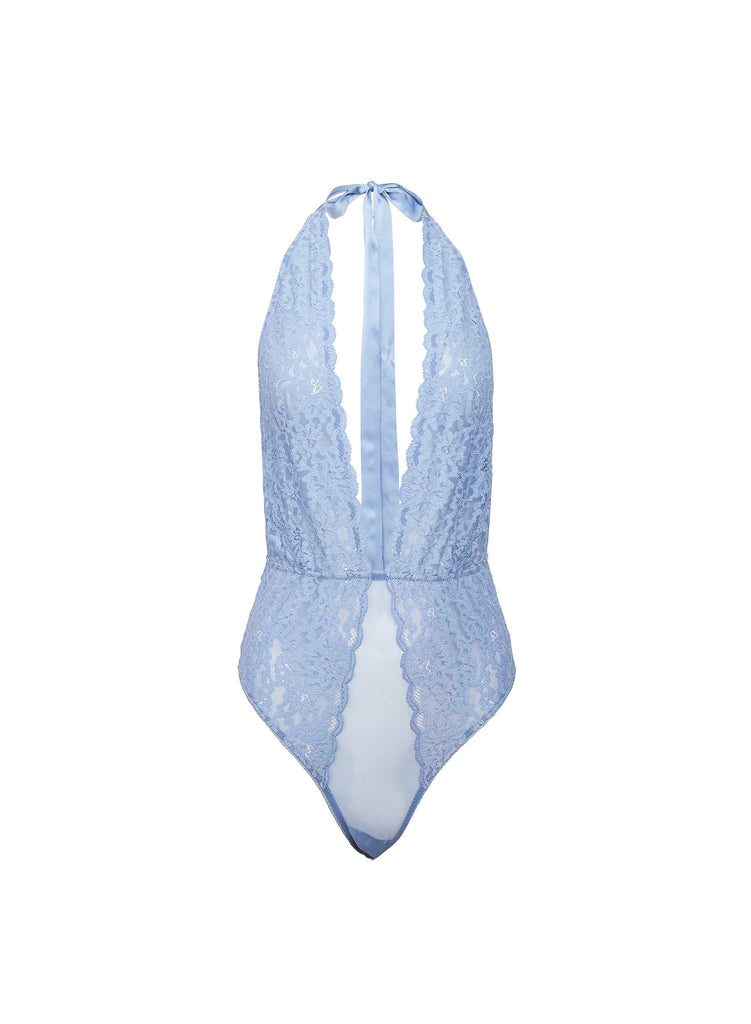Inspired by Charles Baudelaire's masterful collection of poetry entitled "Les Fleurs du Mal," Jennifer Zuccarini founded Fleur du Mal with the belief that wearing beautiful lingerie should be an everyday affair. Tastefully provocative, the luxury brand has amassed a cult following of devotees who adore the sultry and empowering pieces. Cut from comfortable stretch lace with sheer mesh bottom paneling, the Charlotte Halter Teddy in Ciel is ultra flattering, especially with its sexy open back and silk tie closure. Thong cut, we love it out with jeans, or on its own in those special moments.