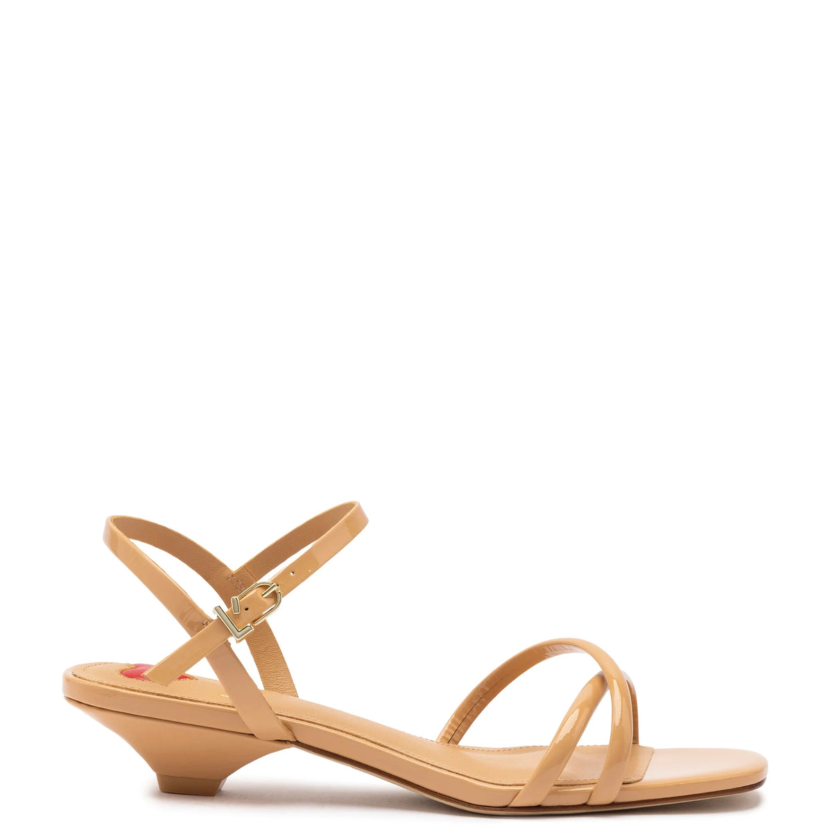 Tan soft patent leather. Open round toe. Adjustable ankle strap. 0.9" heel. Finely crafted leather sole for support, durability, and comfort. Insole with memory foam cushion and hot stamp logo. Handmade in Brazil.