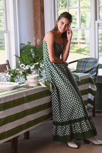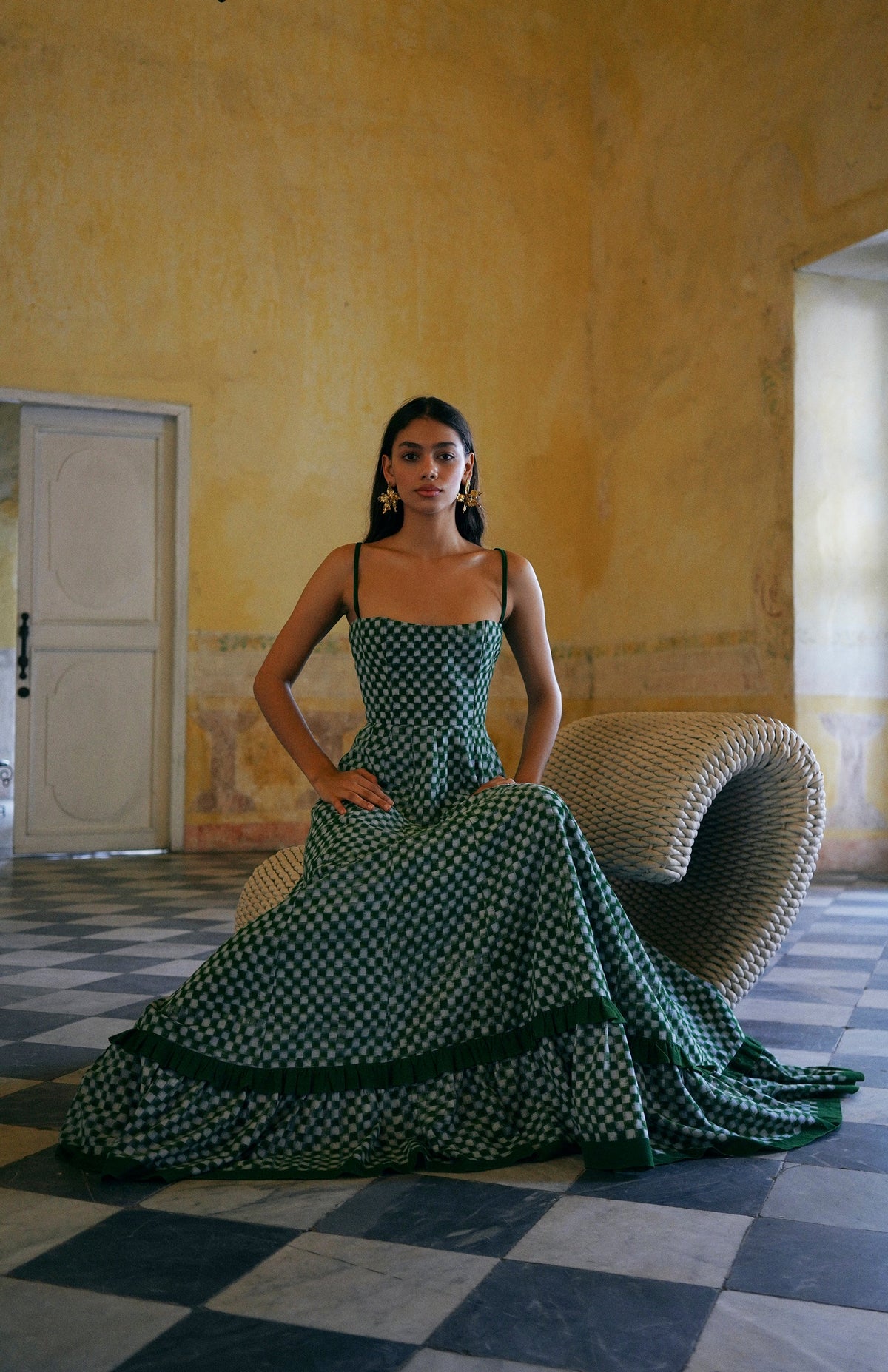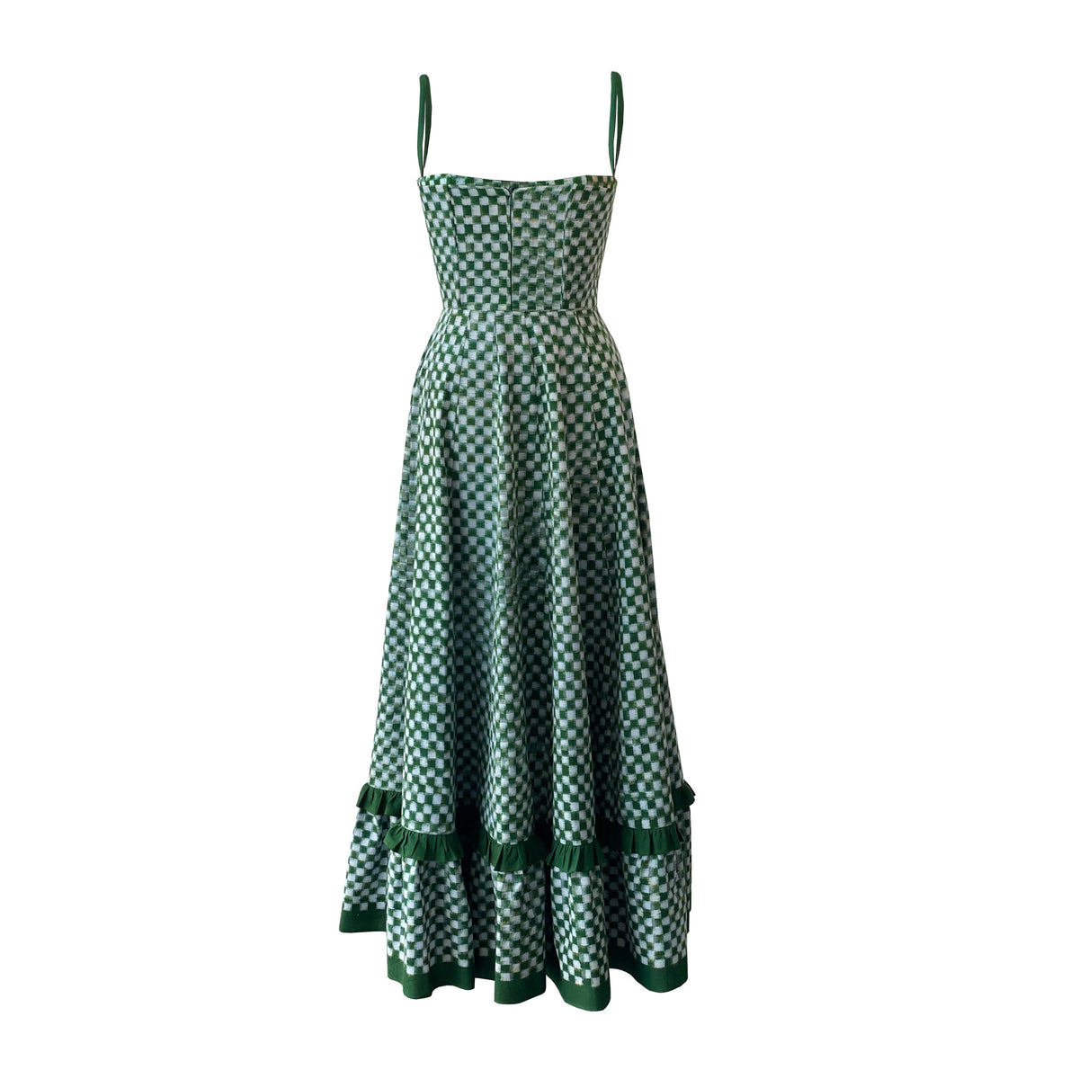 De Castro showcases a seamless and unique blend of traditional Indian craftsmanship, contemporary design, and the founder’s Colombian heritage. Every piece is handmade by artisans, using time-honored techniques and the finest cotton and silk fibers, resulting in exceptional quality, sustainability, and style. Boasting a full length, cinched waist, and corset bodice, what makes the Checkmate Dress stand out is its green and white handloomed ikat pattern. We also love the tiered detail, for a touch of romance.