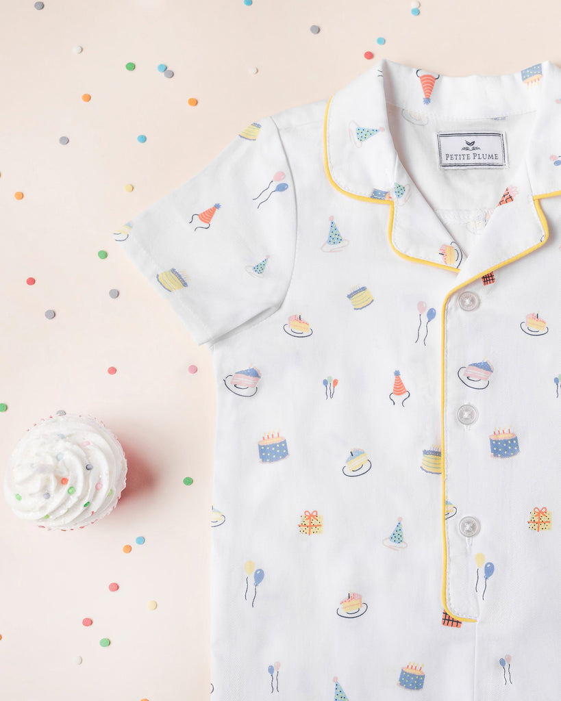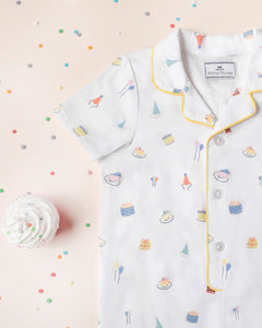 Petite Plume’s luxury sleepwear is a dream come true. Crafted in exquisite cotton with the finest attention to detail, Petite Plume delivers the utmost comfort and sophistication. All rendered in an artful palette of coral, blue, teal, and gold, the Children’s Birthday Wishes Short Set features striped party hats, cake with candles, beribboned presents, and balloons.