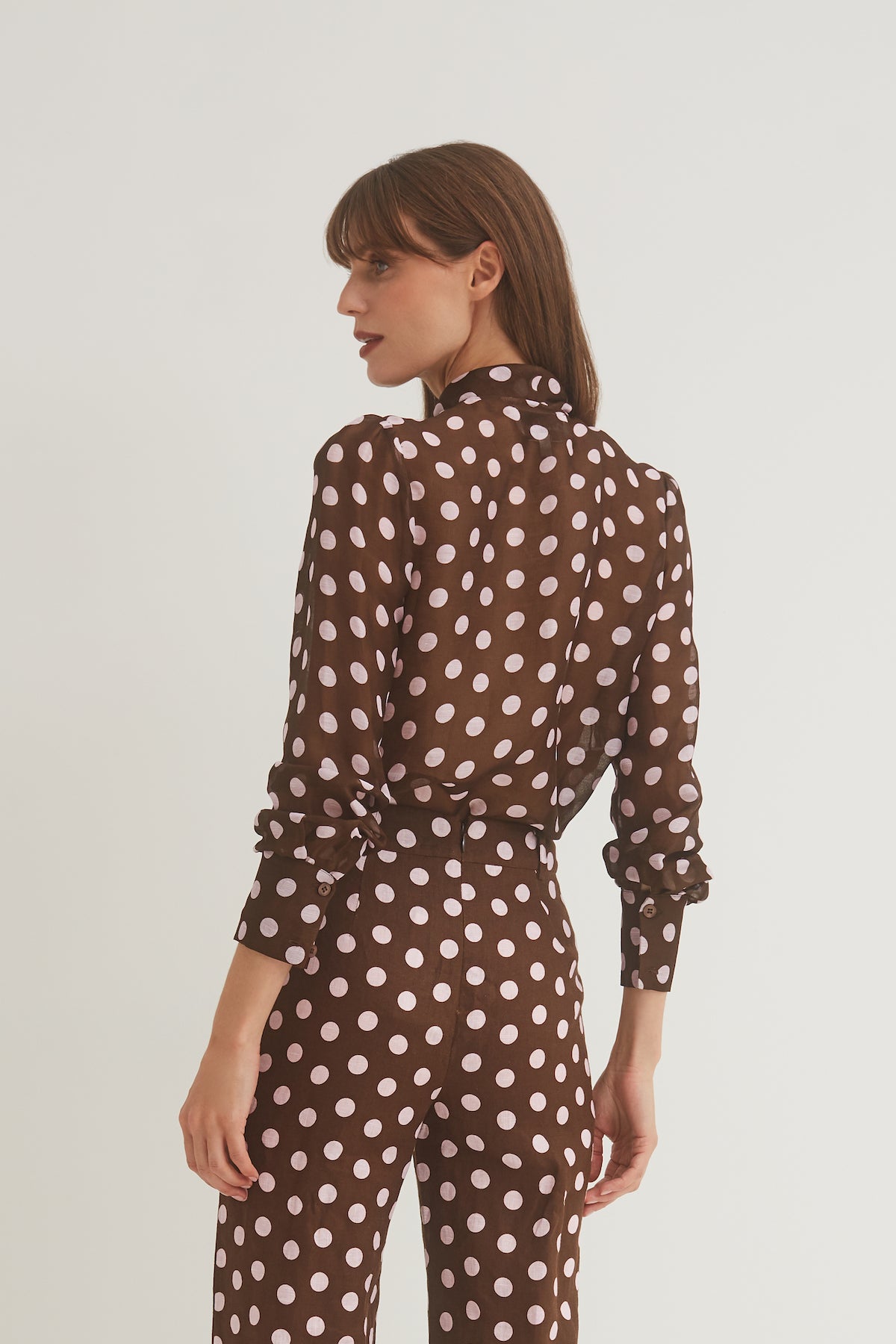 Founded by three New York City-based mothers who met through their kids, Cara Cara’s hallmarks include crisp poplin, house-designed prints, and casual glamour. The inspiration for their ethical womenswear comes from interior design, as well as the world’s most exotic locales. The Chili Shirt in Joelle Dot Brown brings a touch of vintage-inspired elegance to modern dressing. Crafted from a lightweight silk-linen blend, this long-sleeve blouse features a soft bow tie neckline, sheer finish, and relaxed silhouette—balancing sophistication with ease for effortless day-to-night styling.