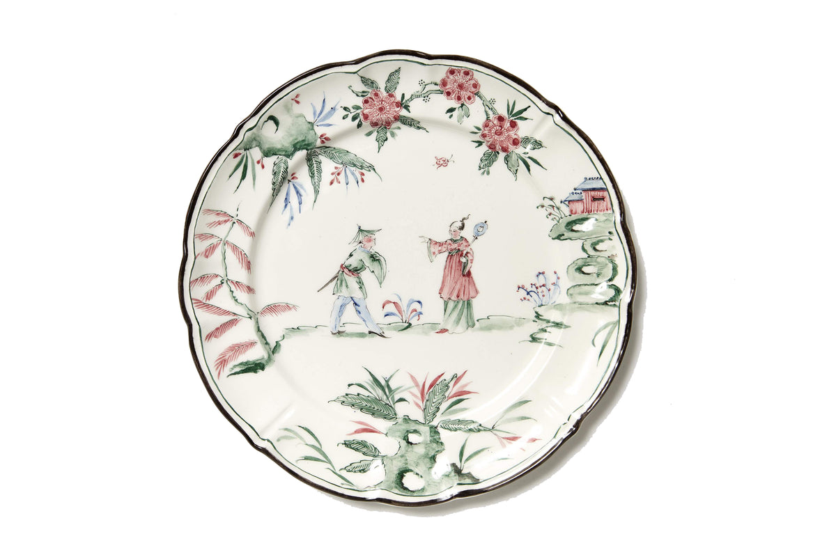 Entirely handcrafted and hand-decorated by artisans at the Milanese ceramic workshop Paravicini, this set of 12 dessert plates has a whimsical, Old-World feel. The detailed design features a lovely Chinoiserie scene in reds and greens.