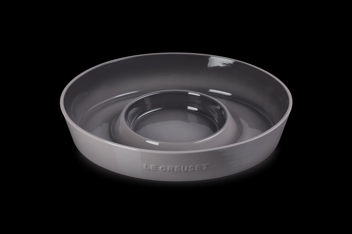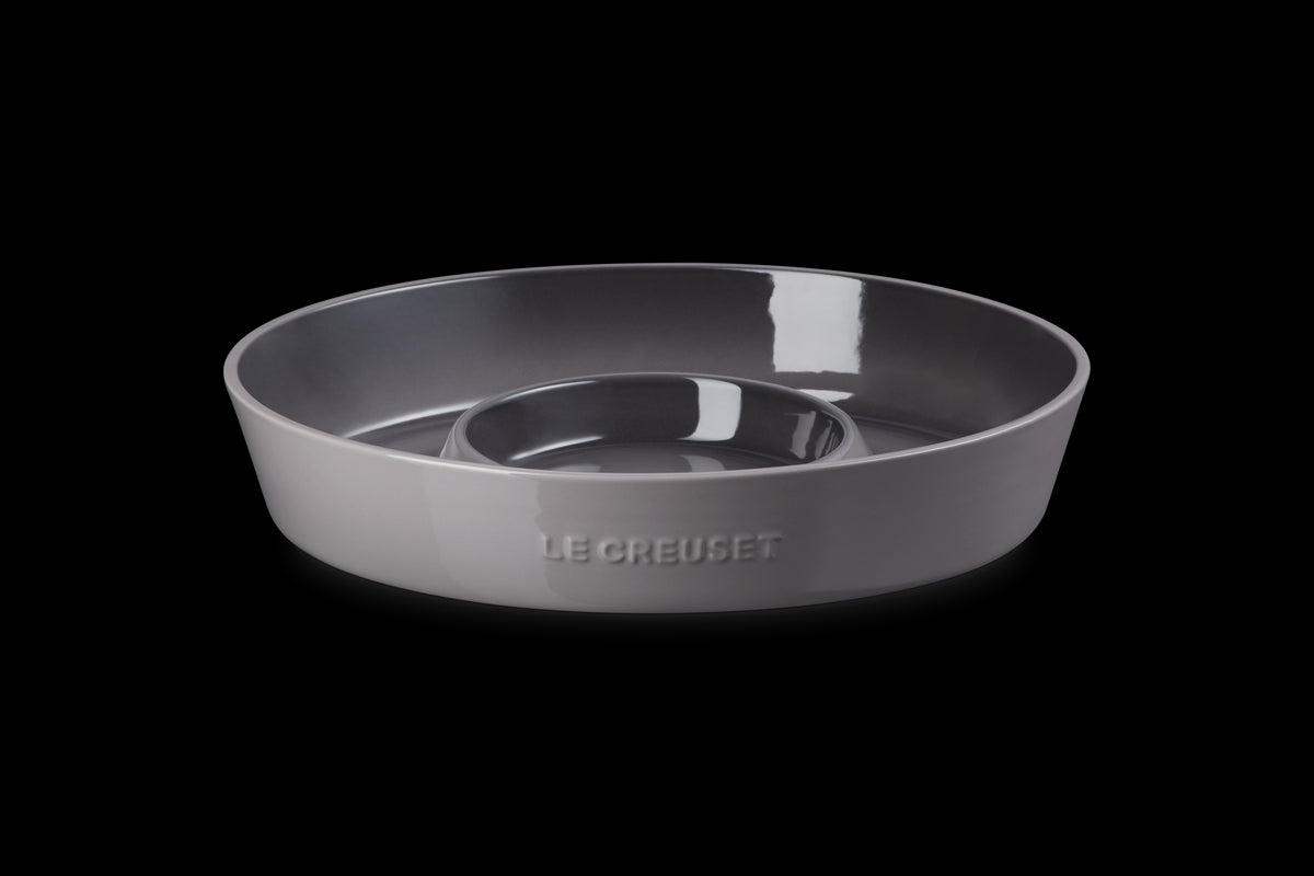 Crafted from premium stoneware for excellent heat retention and uniform temperature. Finished with a vibrant, non-porous glaze that resists scratches, stains, and flavor absorption. Center dip bowl holds sauces, garnishes, or a Mini Cocotte; wide outer section accommodates a variety of snacks or serving arrangements. Designed to seamlessly blend elegance with everyday utility.