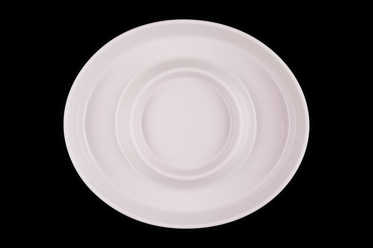 Crafted from premium stoneware for excellent heat retention and uniform temperature. Finished with a vibrant, non-porous glaze that resists scratches, stains, and flavor absorption. Center dip bowl holds sauces, garnishes, or a Mini Cocotte; wide outer section accommodates a variety of snacks or serving arrangements. Designed to seamlessly blend elegance with everyday utility.