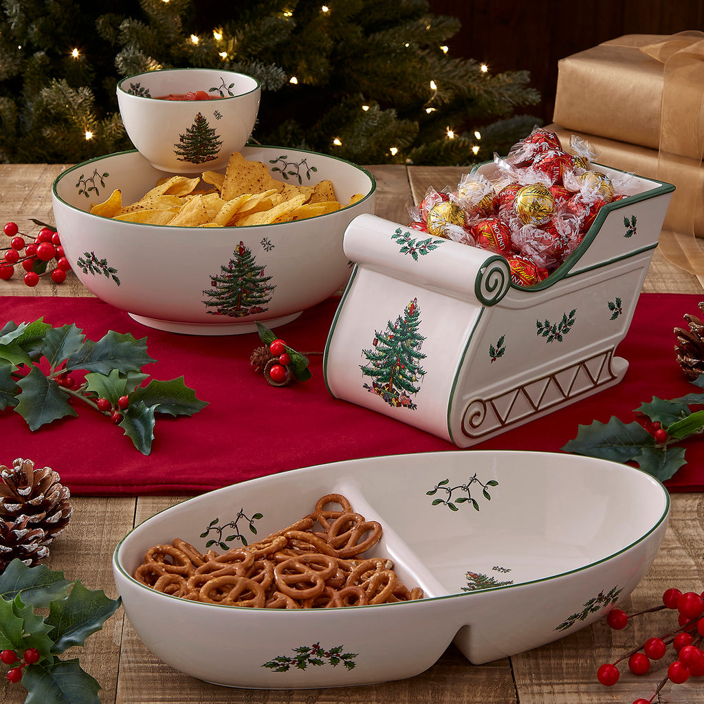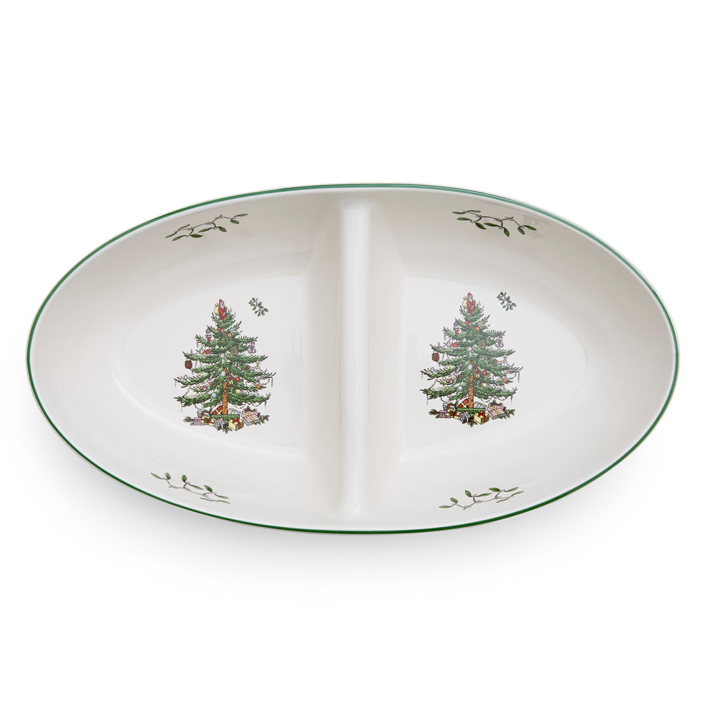 Porcelain. Features Spode’s Christmas Tree design. Divided interior for serving multiple items.