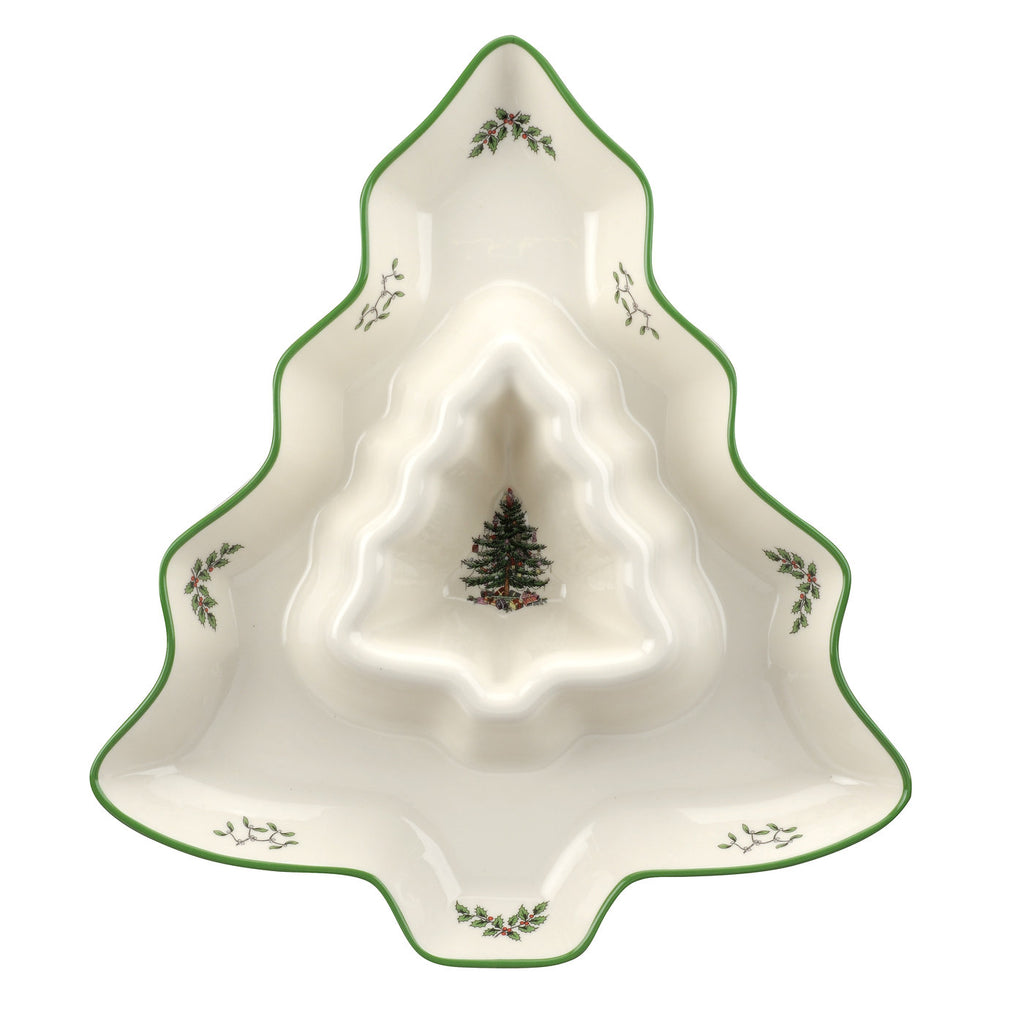 Porcelain. Round design with integrated dip well. Features Spode’s Christmas Tree design.