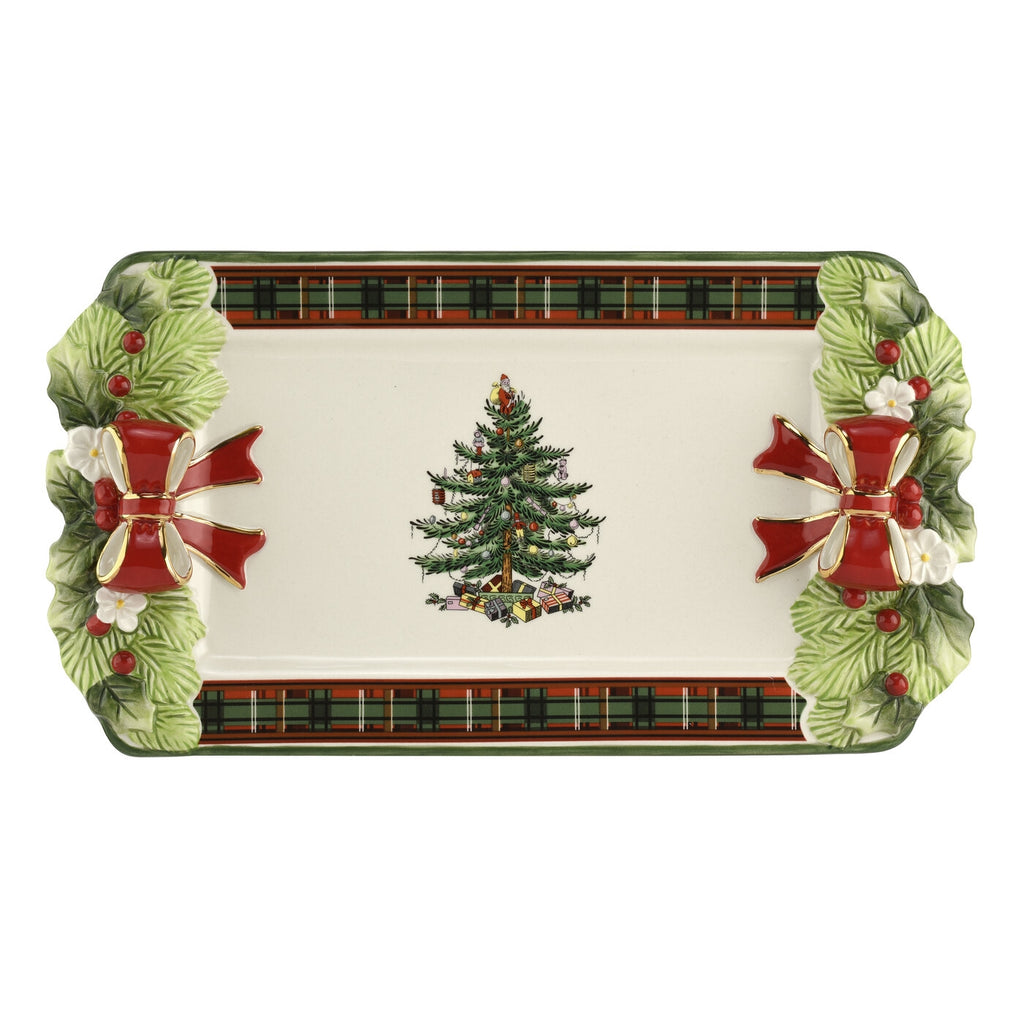 Dolomite. Tree-shaped tray with tartan detailing and Spode’s Christmas Tree design. Suitable for serving or decorative use.