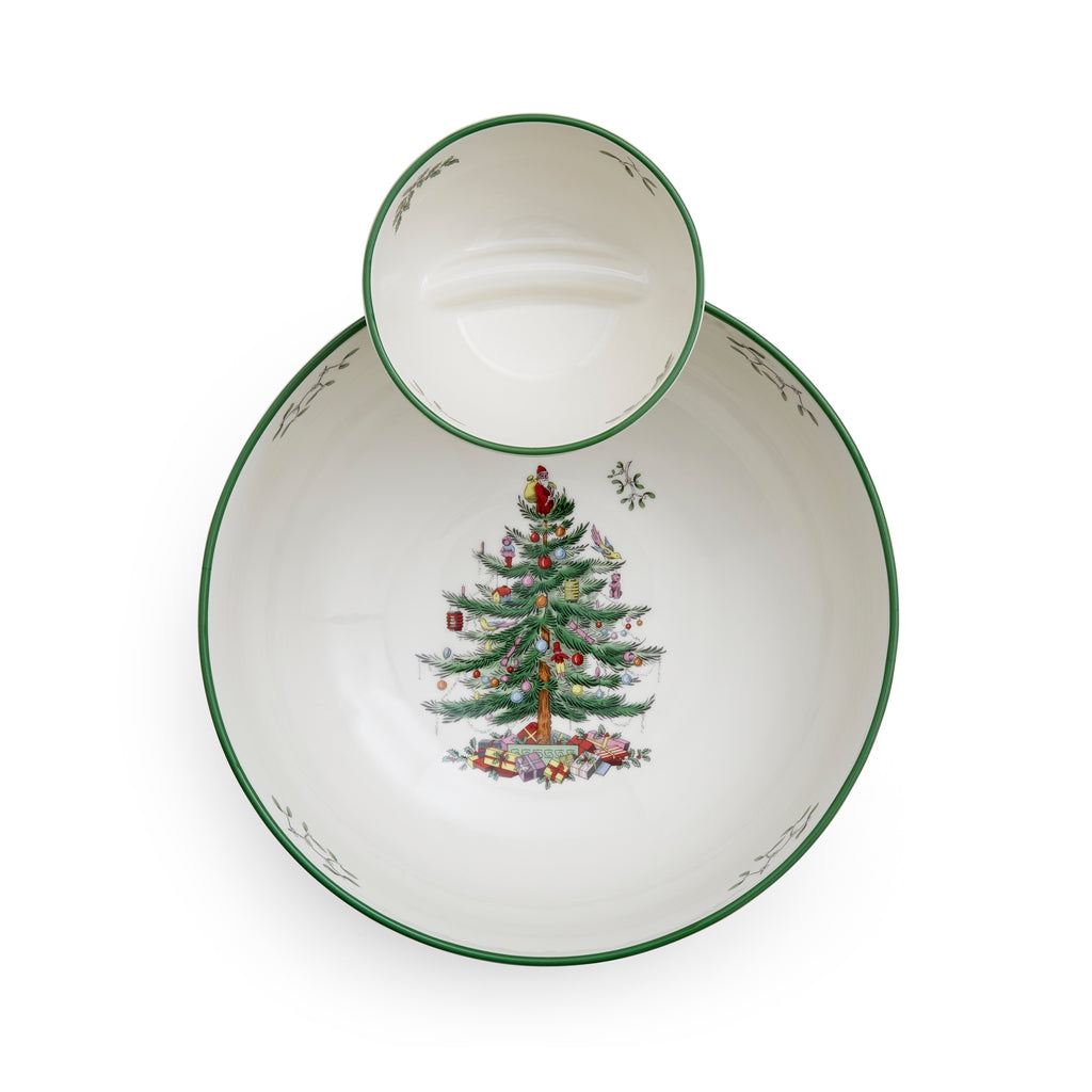 Porcelain. Features Spode’s Christmas Tree design. Two-tiered construction for serving chips, crudités, and dips.