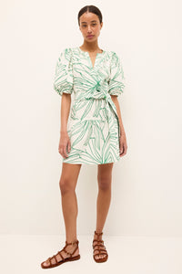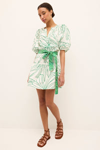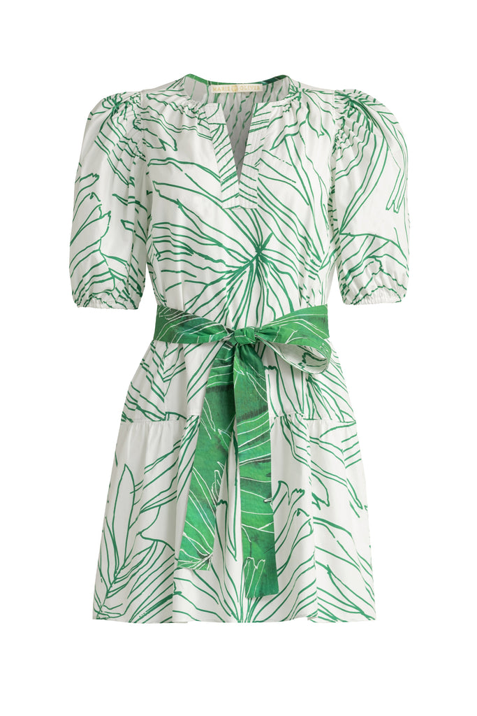 Empowering women through vivid hues and the joy of style, Sarah Doggett Evenson uses her archive of artistic prints, fine fabrics, and flattering silhouettes to make each Marie Oliver piece instantly uplifting. Modern design details—puffed sleeves, a stand-up ruffle along the neckline, and an optional (and reversible) tie belt—elevate this Clara Dress in Palm. The chic silhouette has a line-drawn botanical print in a fresh green-and-white color palette underscores the breeziness of this effortless style.