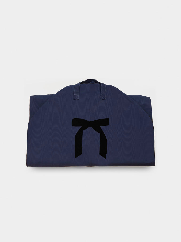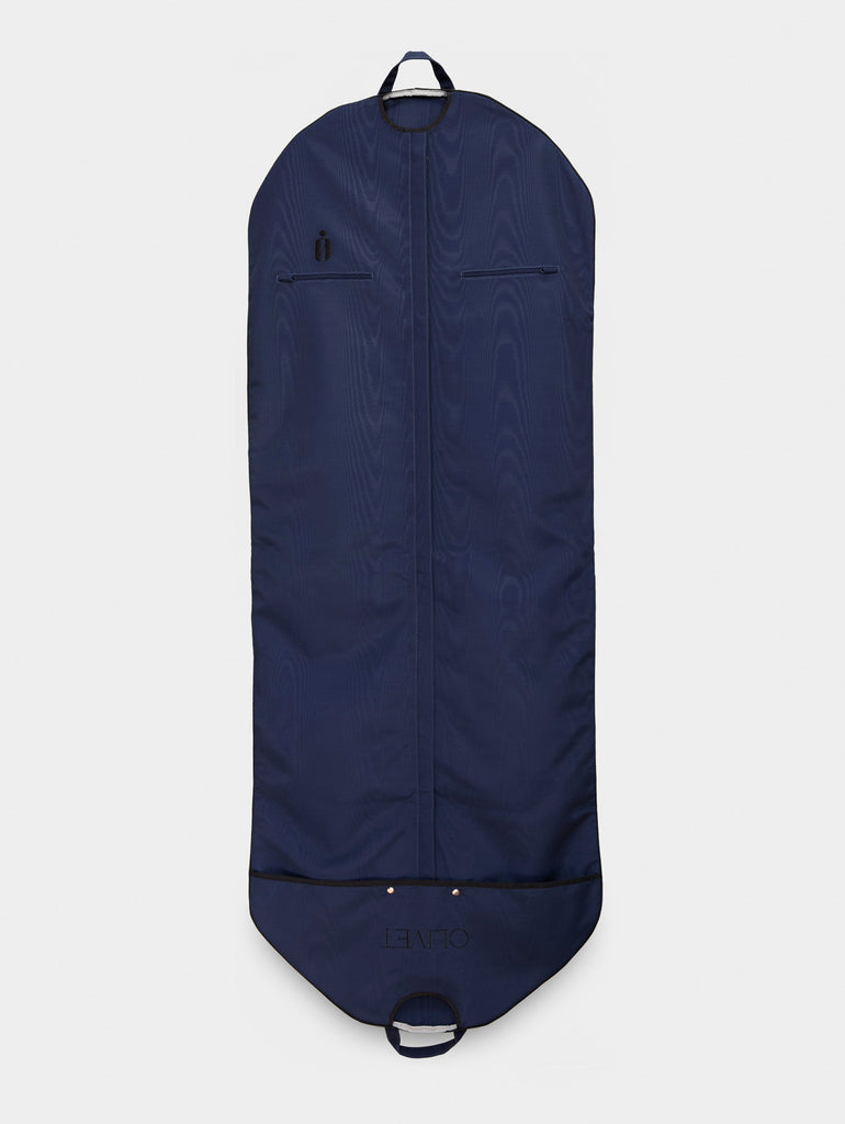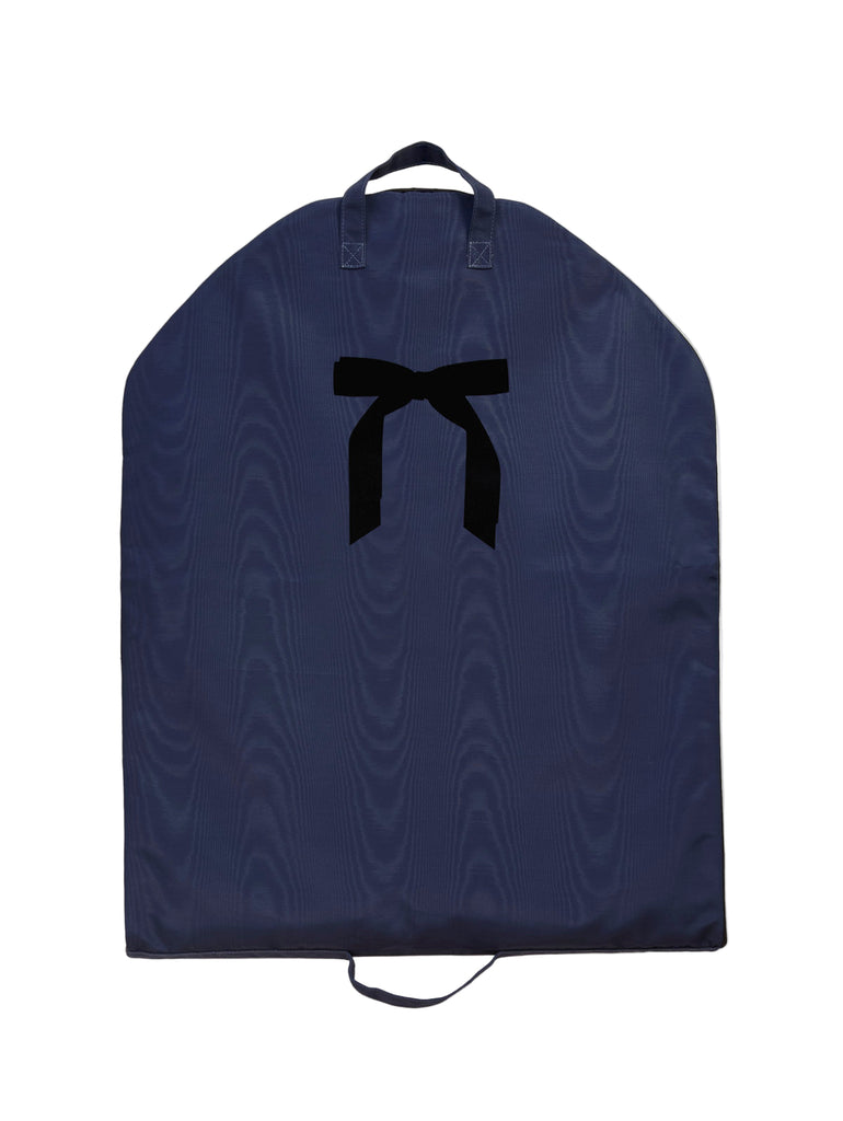 ’Tis the season to travel beautifully. The Holiday Bow Classic Bag in Sapphire Night adds a refined, festive touch to holiday journeys. Crafted in deep navy poly moiré, it features a black flocked bow with matching piping and embroidery. Extra-long to accommodate formalwear, it includes two interior pockets and folds seamlessly for easy carrying. Custom embroidery available over the right interior pocket.