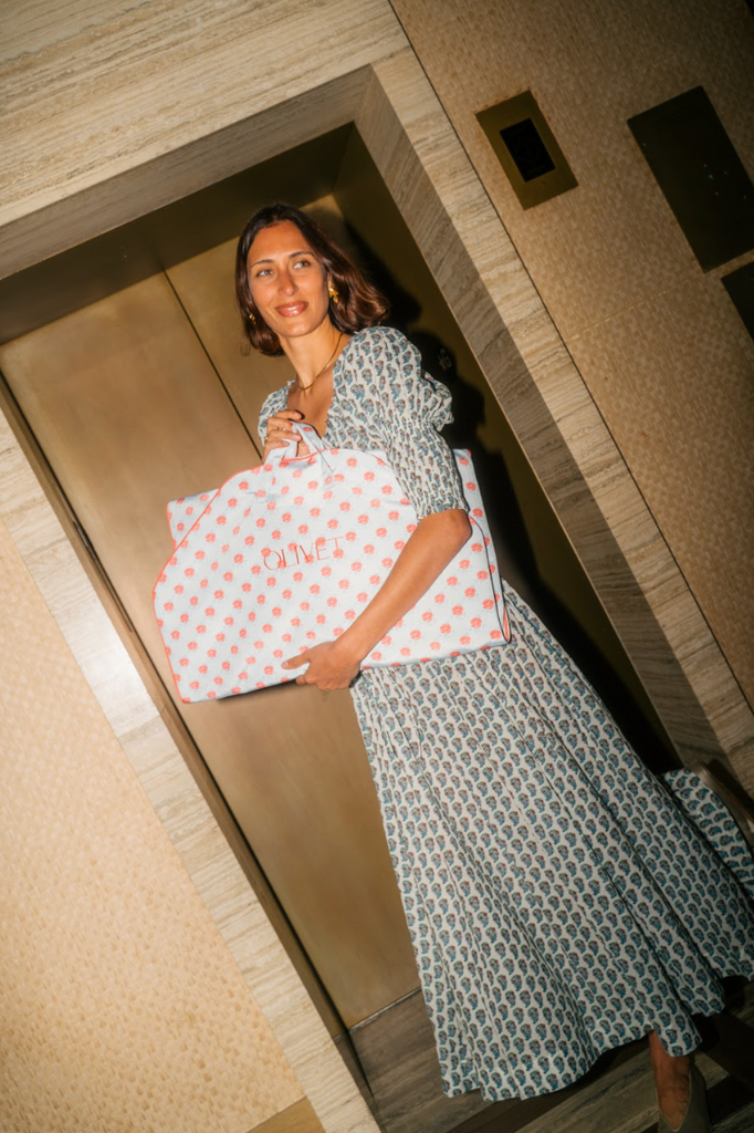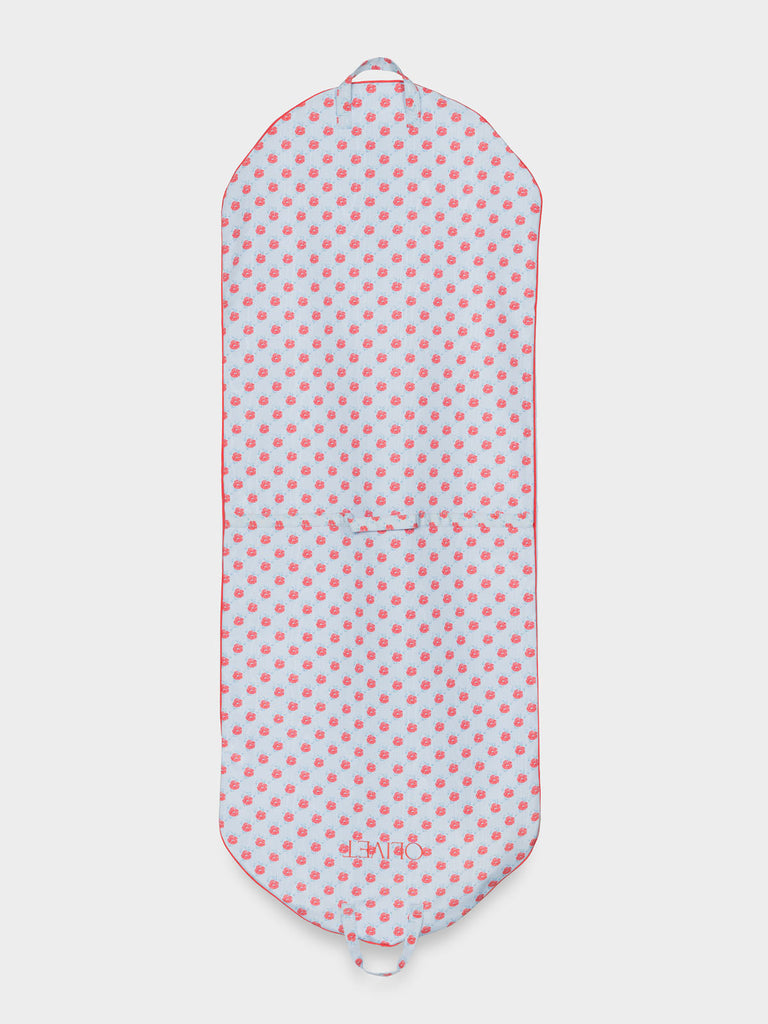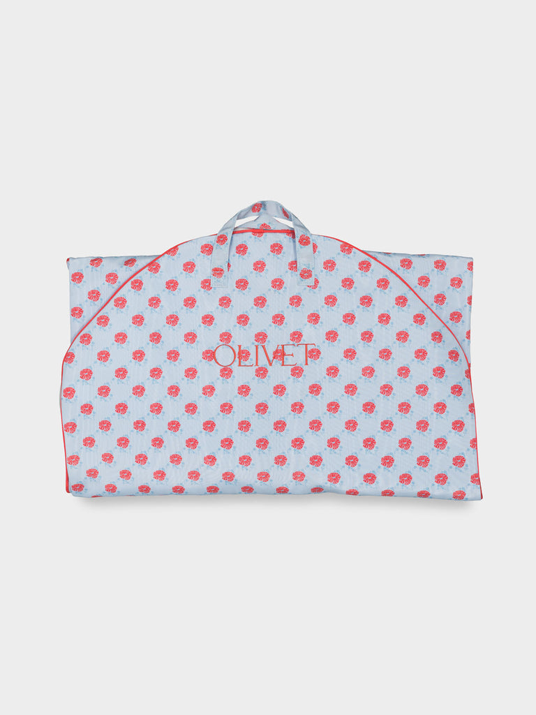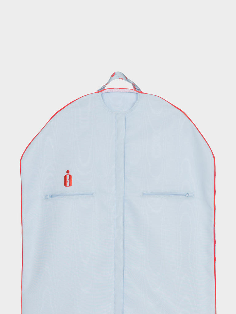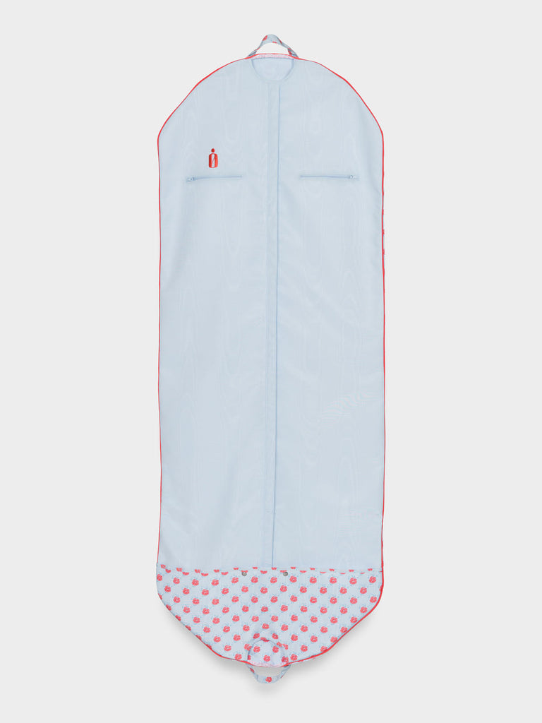 Travel chic and make it fun. The Classic Bag in Ditzy Blue Poppy adds personality and polish to every journey with its playful floral print on poly moiré. Lined in Bridal Blue poly moiré and finished with Spice Coral piping, it’s extra-long to accommodate formalwear and includes two interior pockets for accessories and essentials. Thoughtfully designed for seamless travel, it folds easily for carrying at any length. Custom embroidery available over the right interior pocket.