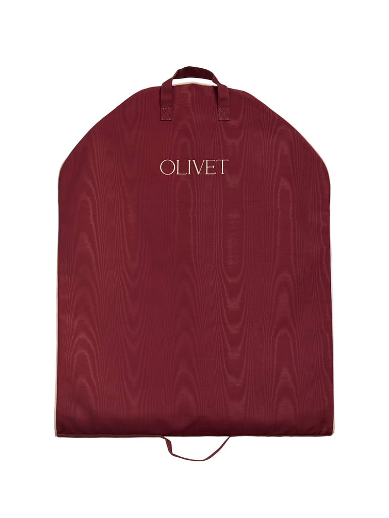 A new season calls for a new hue. The Classic Bag in Cabernet features a rich tone with ivory embroidery and piping. Crafted from signature poly moiré, it brings timeless design and modern polish to every journey. Extra-long to accommodate formalwear, it includes two interior pockets for accessories and essentials and transitions effortlessly from full-length to compact fold, with handles at each length for easy carrying. Custom embroidery is available over the right interior pocket.