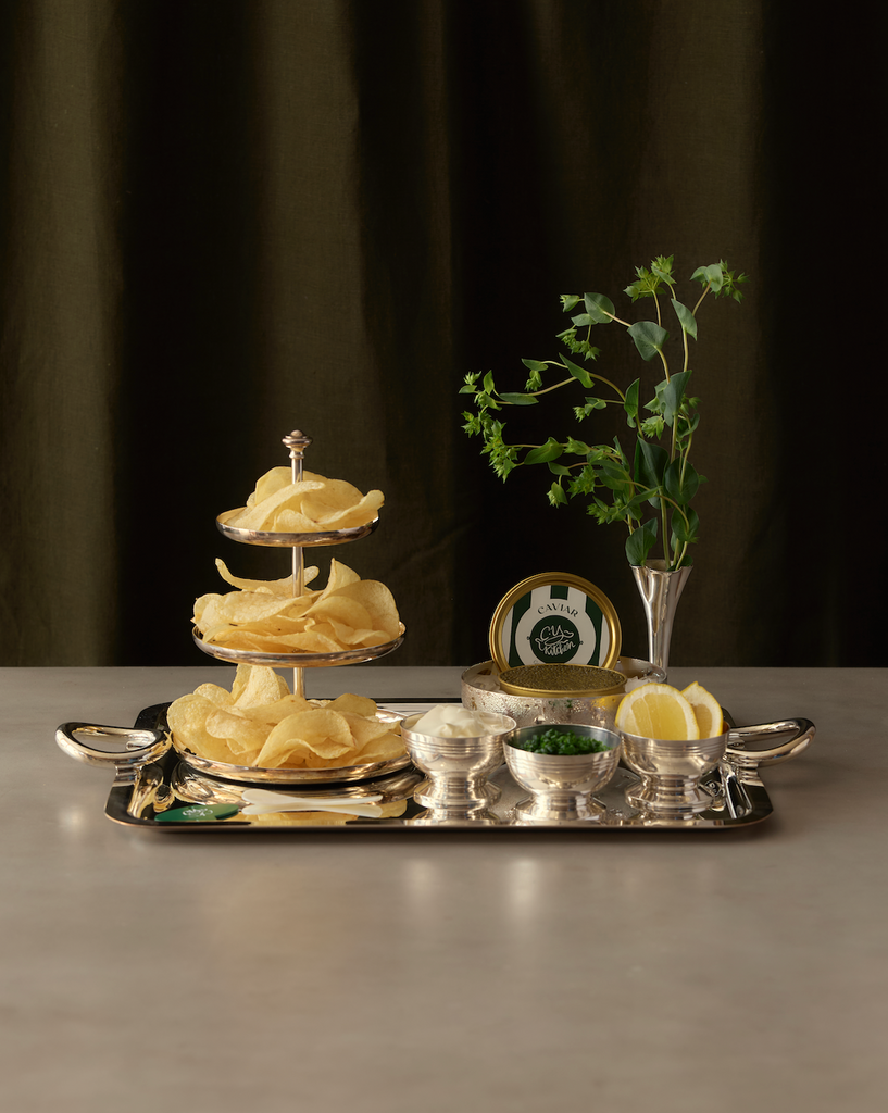 The Classic Caviar & Chips Set is CY Kitchen’s signature pairing—simple, elegant, and endlessly indulgent. Each size option combines Golden Ossetra Caviar with creamy Vermont Crème Fraîche and crisp Bonilla a la Vista Potato Chips for a sophisticated take on a universally loved combination. Designed for effortless entertaining or elevated snacking, it’s the ultimate expression of casual luxury.