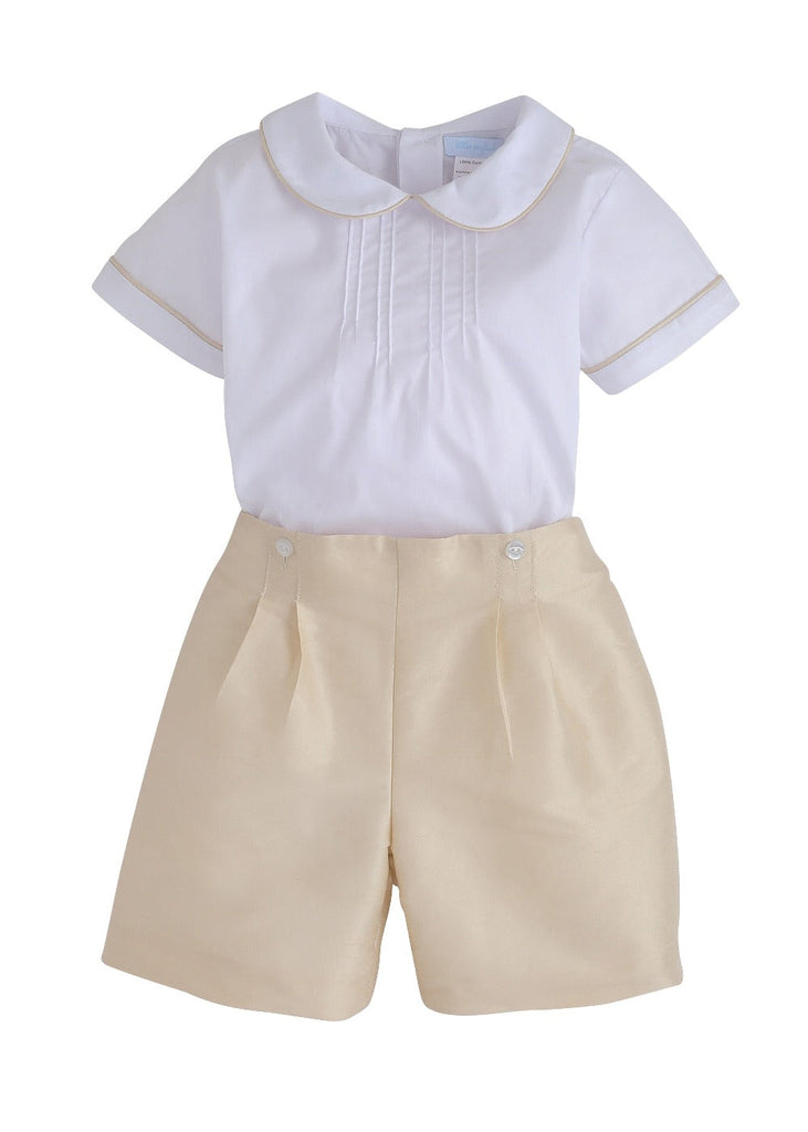 Shannon Latham founded Little English in 2004 with the belief that children should always be well-dressed. Employing hand-smocking, hand-embroidery, and the very best fabrics, Shannon and her daughter design timeless pieces that will be worn for generations to come. Whether it’s a wedding ceremony or just tea with grandma, the Classic Wedding Short Set is the mini formal wear you will continuously reach for. A traditional two-piece, this set boasts a Peter Pan collar, as well as pintucks at the chest and elastic on the waistband.