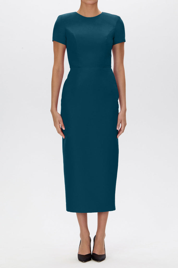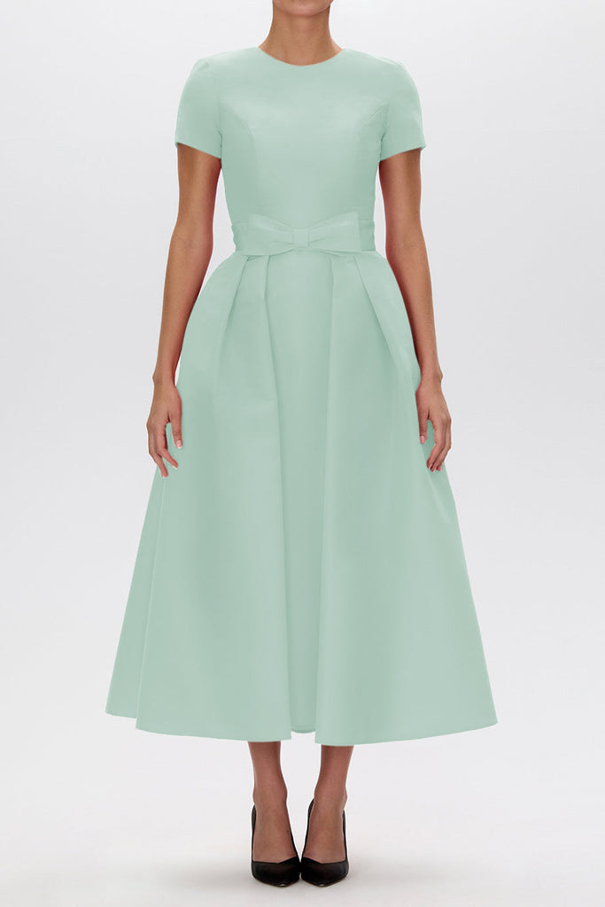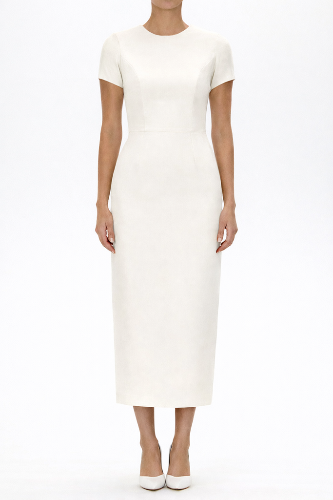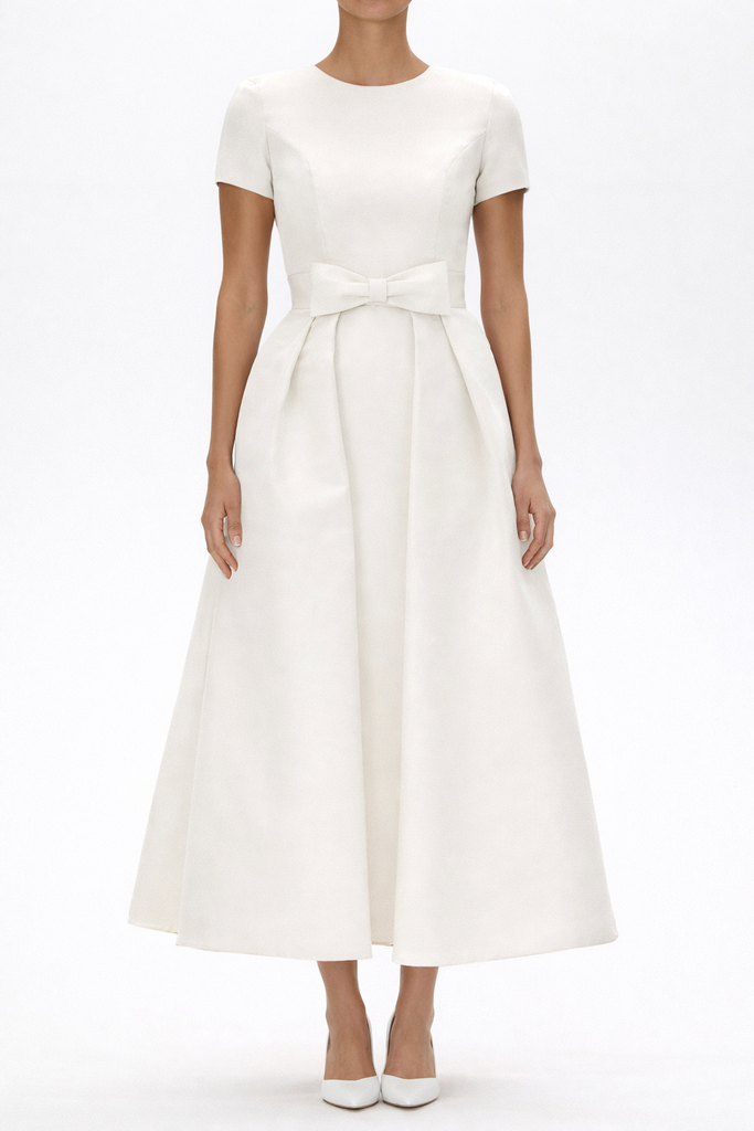 The Claudia Silk Faille Midi Dress with Mid-Length Bow Convertible Skirt from the Alexia María 2026 Collection is a study in layered elegance. Crafted in luxurious silk faille, this refined silhouette features a jewel neckline and structured short sleeves that frame the fitted bodice before falling into a sleek midi pencil skirt. A detachable pleated overskirt, finished with a sculptural front bow, introduces graceful volume and transforms the look from understated sophistication to a more expressive cocktail statement. Handcrafted in the California atelier, Claudia offers versatile elegance for modern celebrations.