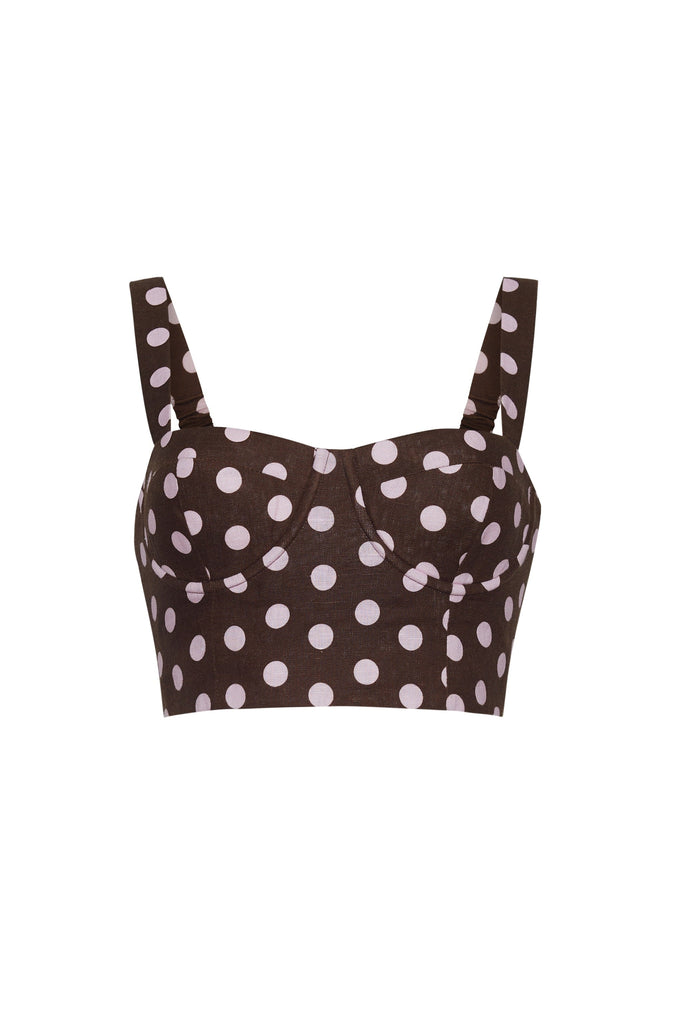 Cropped corset-style top in linen with allover dot print. Sweetheart neckline with metal underwire for support. Boning at bodice for structure. Smocked back and elastic at back of straps for flexibility. Self-covered back zipper. Bra cups. Bodice and cups fully lined.