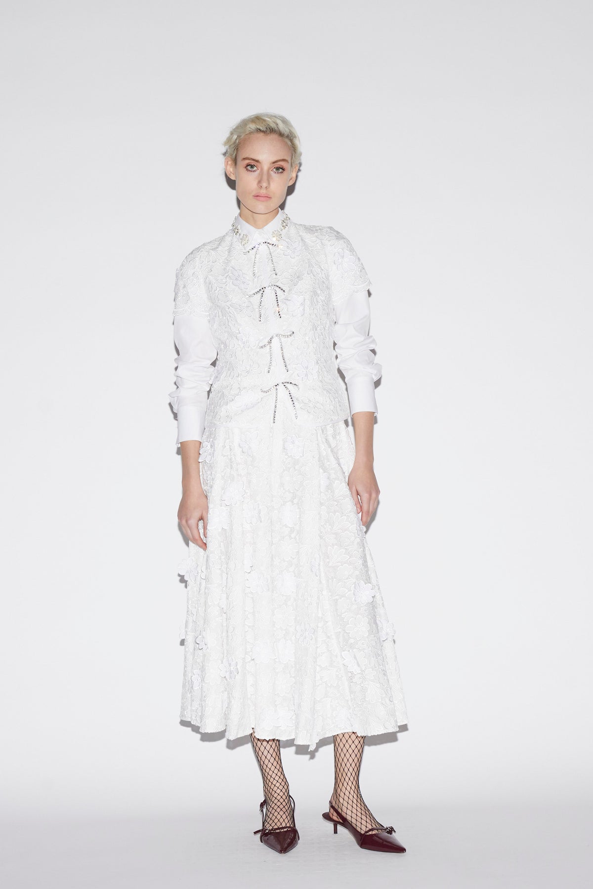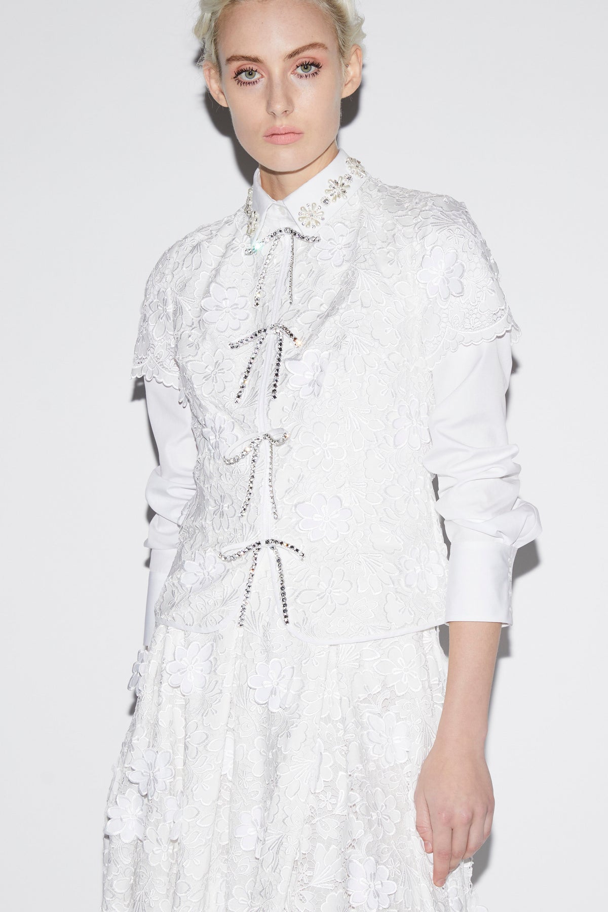 The London-based luxury brand, Huishan Zhang, was launched in 2011. As a Chinese-born designer, Huishan combines his heritage with Western influences to create a sophisticated, signature style. The Claudine Top in White Embroidered Cotton features a crisp short-sleeved silhouette adorned with crystal bow tie closures down the front. Its delicately embroidered floral motifs offer dimension and charm, bringing a soft elegance to both day and evening looks.