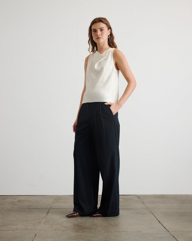Creating clothing that inspires confidence, celebration, and community, Tanya Taylor is a New York-based womenswear brand whose mission is to provide practicality and style to a range of ready-to-wear in inclusive sizes. Each collection is thoughtfully designed through the artful use of color, texture, and original hand-painted prints. The Clorinda Top in Ivory is an elegant satin crepe separate designed for elevated ease. With a softly draped neckline and flattering bias cut, it offers a luxurious feel and graceful movement—ideal for layering or standing alone in polished day-to-night looks.