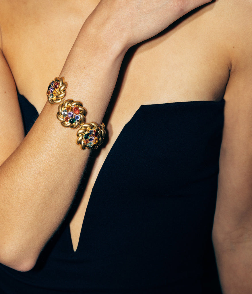 Loren Barham founded her jewelry line in 2005 as a means to reconnect with the vintage jewels that inspired her as a child. Today, the dynamic, artistic, original pieces of Loren Hope, designed at their flagship store in Newport, Rhode Island, serve as a bridge between nostalgia and thoroughly modern women everywhere. Channeling major 1980s glamour, the Colette Bracelet dazzles with oversized, candy-colored gems framed in puffy gold rope detailing. Bold, festive, and irresistibly chic, it brings a burst of joyful sparkle to any occasion.