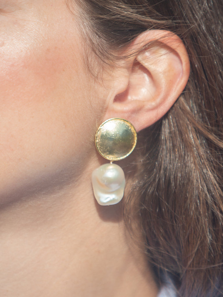 The Colette Earrings in Gold & White showcase lustrous freshwater pearls suspended from gleaming gold-plated posts, creating a timeless balance of sheen and sculptural simplicity. Their elongated silhouette offers graceful movement and an elegant finishing touch to any look.