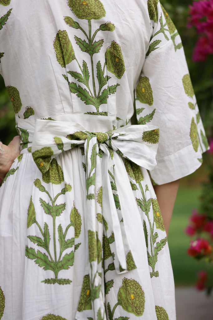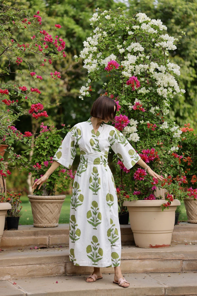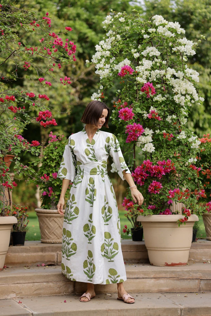 Introducing Maison Marigold, a new luxurious small-batch women’s resortwear brand inspired the wanderlust of travel. Our collections effortlessly transition from beachside lounging to an elegant evening on the town. The simplicity of design and classic silhouettes are the foundations for each and every style. Hand-printed linen and cotton make for comfortable and effortless pieces that are both feminine and flattering. The Como Floral Wrap Dress in Green Flower was designed for a figure-flattering wrap style and a classic V-neckline. The wrap style allows for a customizable fit, making it comfortable and perfect as a go-to travel dress.