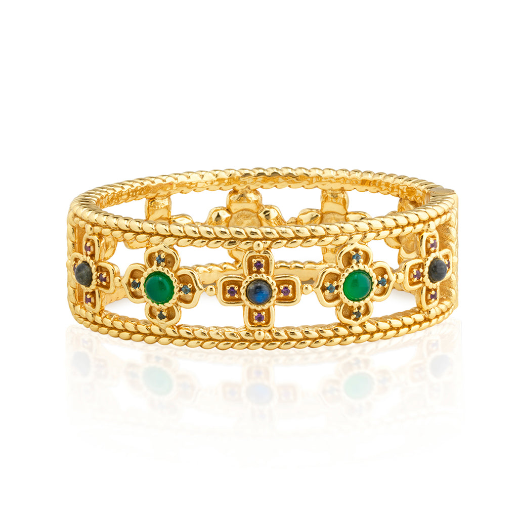 Half-Parisian, half-Texan, Capucine De Wulf’s unique upbringing was the inspiration for her namesake jewelry line. Her accessories combine French romance with an American sensibility. The Contessa Hinged Bangle showcases a rhythmic dance of Byzantine-inspired motifs adorned with green onyx, London blue topaz, amethyst, and blue labradorite gemstones. Finished with a braided gold border and exquisite detailing, this ornate bracelet exudes timeless elegance and regal allure.