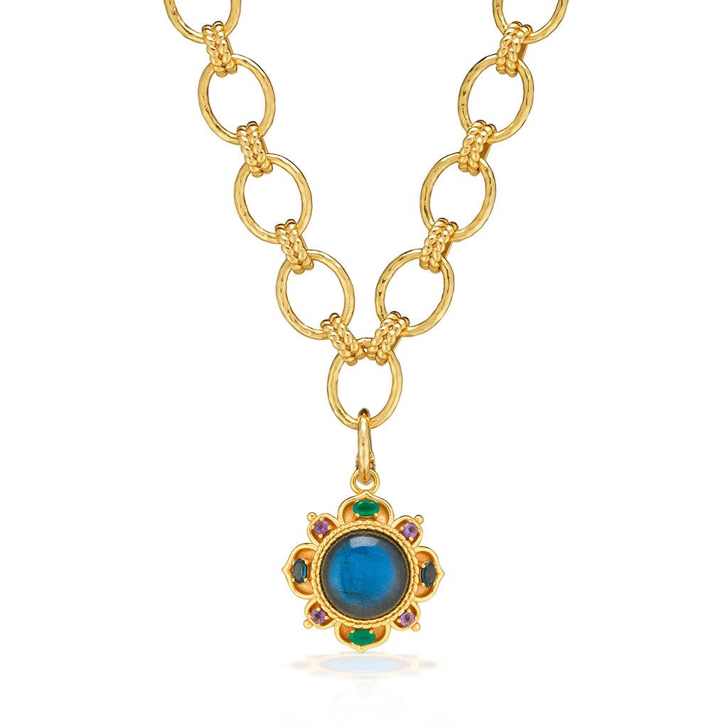 Half-Parisian, half-Texan, Capucine De Wulf’s unique upbringing was the inspiration for her namesake jewelry line. Her accessories combine French romance with an American sensibility. The Contessa Pendant is a true royal treasure, featuring a luminous blue labradorite center framed by Moorish arches bejeweled with amethyst, green onyx, and additional blue labradorite gemstones. Intricate golden detailing—from the Byzantine-inspired silhouettes to the braided trim—adds a touch of opulence to any chain, ensuring this medallion makes a statement wherever it’s worn.