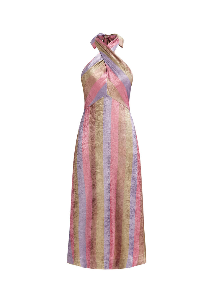 The Copacabana Halter Midi Dress in Disco Stripe captures the spirit of celebration with luminous movement and modern allure. Crafted in multi-stripe metallic lamé, this playful silhouette shimmers with every step. A straight halter neckline with a self-tied bow and a defined waist create a flattering fit, while side seam pockets add ease. Designed to shine from cocktail parties to festive soirées, it’s a radiant interpretation of timeless glamour.