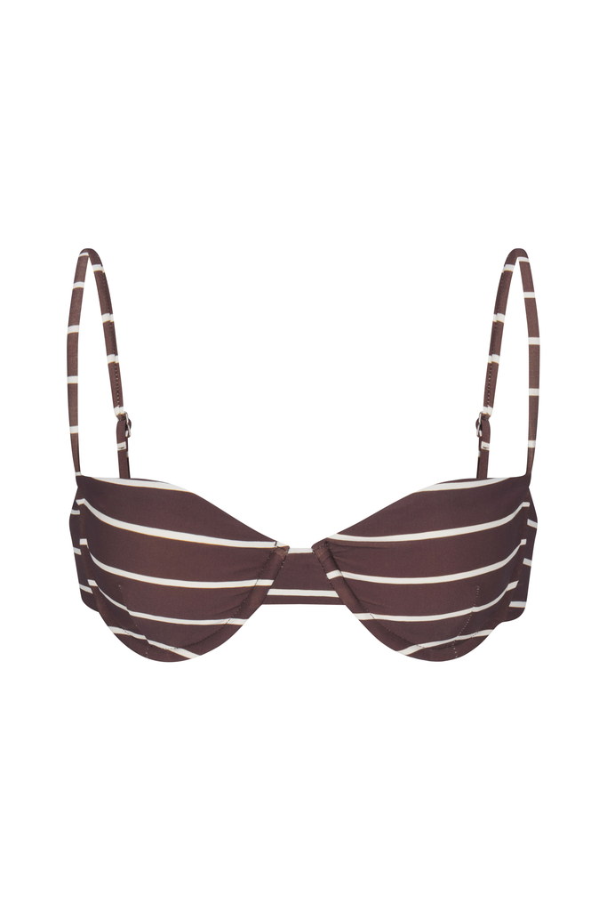 Focusing on minimalism and sustainability, California natives Lauren Arapage and Joshua Shaub founded Anemos to share their home state’s laid back vibes, and their honed fashion aesthetic, to swimmers and beachgoers on every coast. Inspired by French lingerie, the Balconette Underwire Bikini Top in Espresso Odd Stripes is alluring from every angle. Offers both light support and everyday glamour.