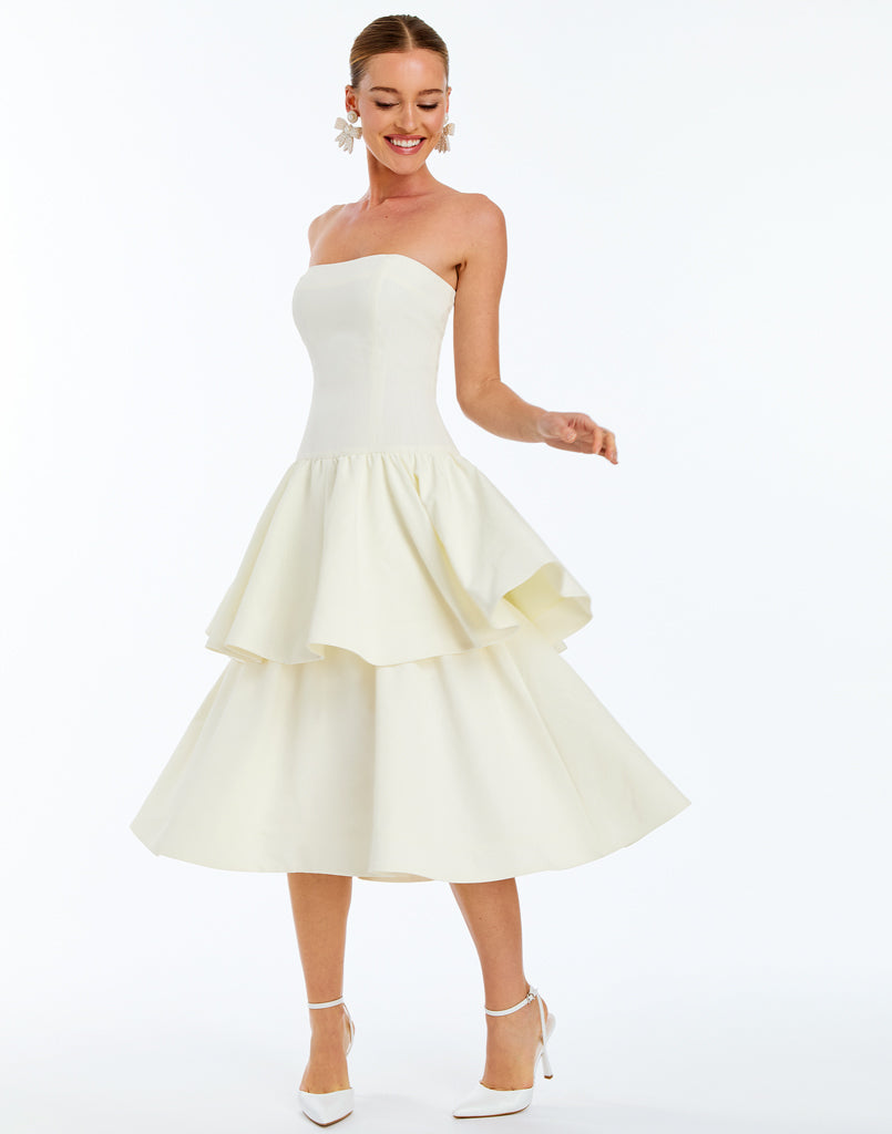 Welcome to the enchanting world of Mestiza New York, where heritage meets haute couture. Founded by Alessandra Perez-Rubio & Louisa Rechter Takacs, this brand is a tribute to their shared Filipino roots and the timeless elegance of their foremothers. Each piece, crafted with the highest quality to stand the test of time, will add polish to your wardrobe, and a touch of magic, too. The Cordoba Convertible Gown is here to make outfit changes a thing of the past—because this dress does it all. Designed with hidden zippers, this tiered moiré masterpiece transforms from a grand, drop-waist gown to a midi, and mini. Delicate ruffle details add a touch of romance, while the structured bodice—worn strapless or with removable shoulder straps—keeps you looking flawless at every stage of the celebration. From vows to the last dance, this dress is ready for it all.