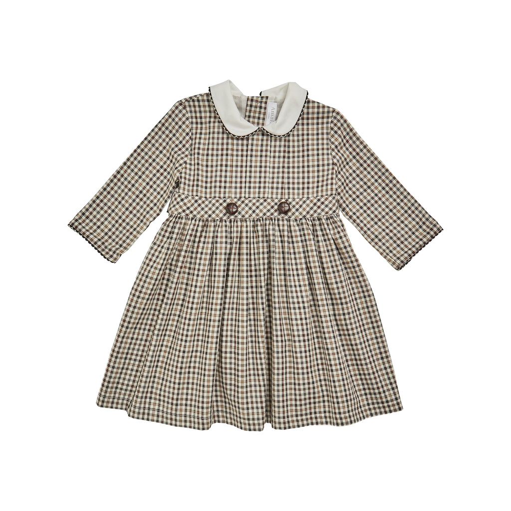 Brown and black check twill. White Peter Pan collar with picot trim. ¾-length sleeves. Fixed waist sash with decorative buttons. Back fastening with mother-of-pearl buttons. Fully lined. Made in Spain.