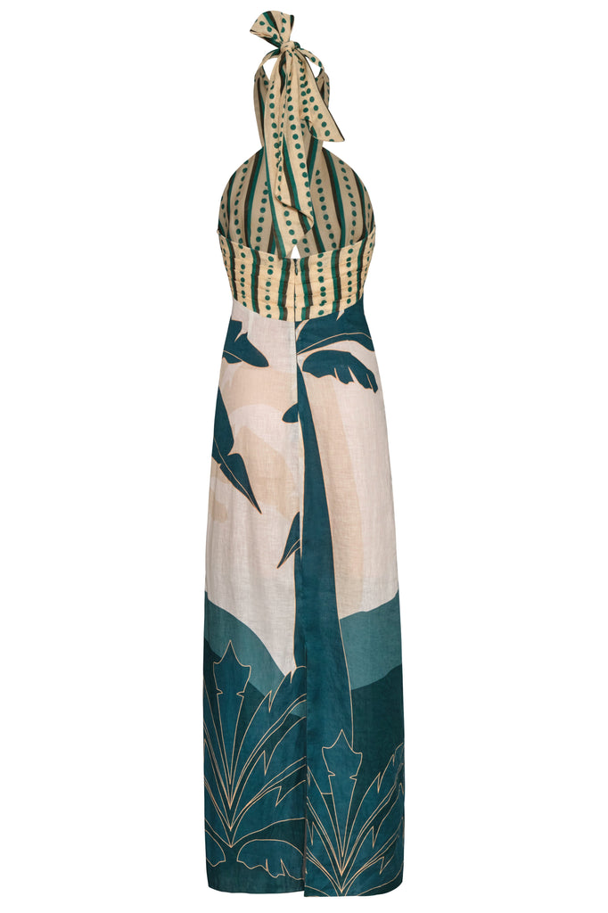 Founded in Cali, Colombia, Juan de Dios is celebrated for its effortless sophistication and artful craftsmanship inspired by Latin American heritage. The Costa del Sol Linen Midi Dress in Aquamarine Palms & Green Stripes captures that spirit through its bold play of print and movement. Featuring a halter neckline that crosses at the front and ties elegantly at the nape, this fluid silhouette contrasts the patterned bodice with a complementary striped skirt. Light and graceful, it’s an ode to warm, sunlit days and evenings by the coast.
