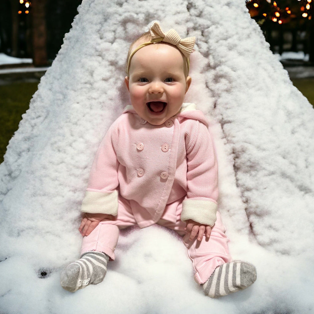 Founded by Claudia Vargish and based in Connecticut, A Soft Idea combines quality, comfort, and craftsmanship through luxurious cottons, chenilles, and imported yarns inspired by Italian and Spanish weaves. The Cotton Seedstitch Double Breasted Jacket in Pink & Cream is a timeless layering piece designed with classic sophistication. Made in Colombia from 100% cotton, this beautifully textured seedstitch knit features a double-breasted front and soft tonal palette, offering cozy warmth and refined charm for little ones.