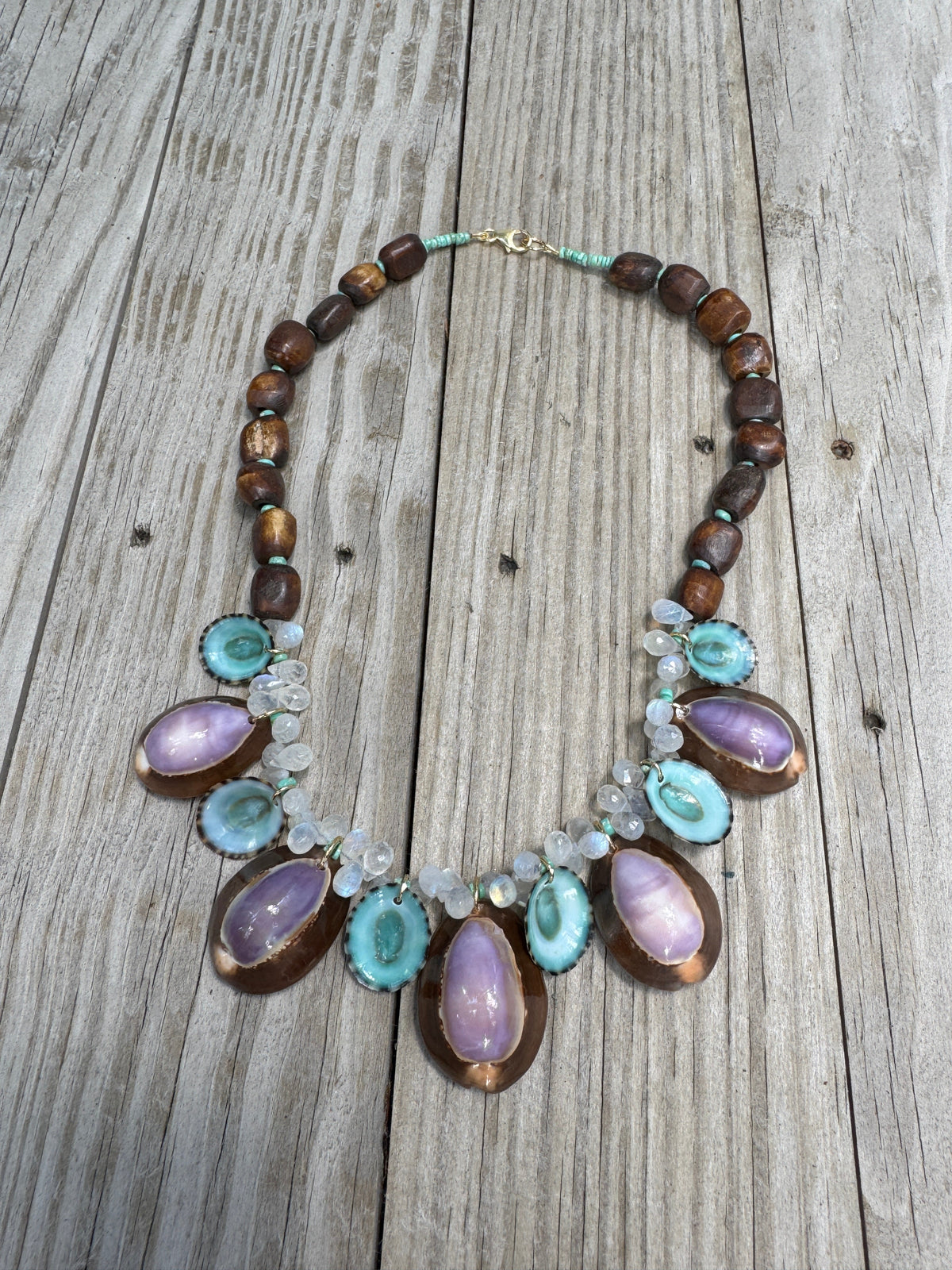 Handmade in Charleston, SC, Theodosia Jewelry captures the quiet elegance of the everyday accessory through thoughtfully chosen precious and semiprecious stones. Each piece is a modern heirloom—crafted with intention, rich with meaning, and designed to be treasured. The Cowrie Shell Collar boasts moonstone, wood, green limpet, and cowrie shells that create an eclectic collar with a 14-karat gold-filled clasp.