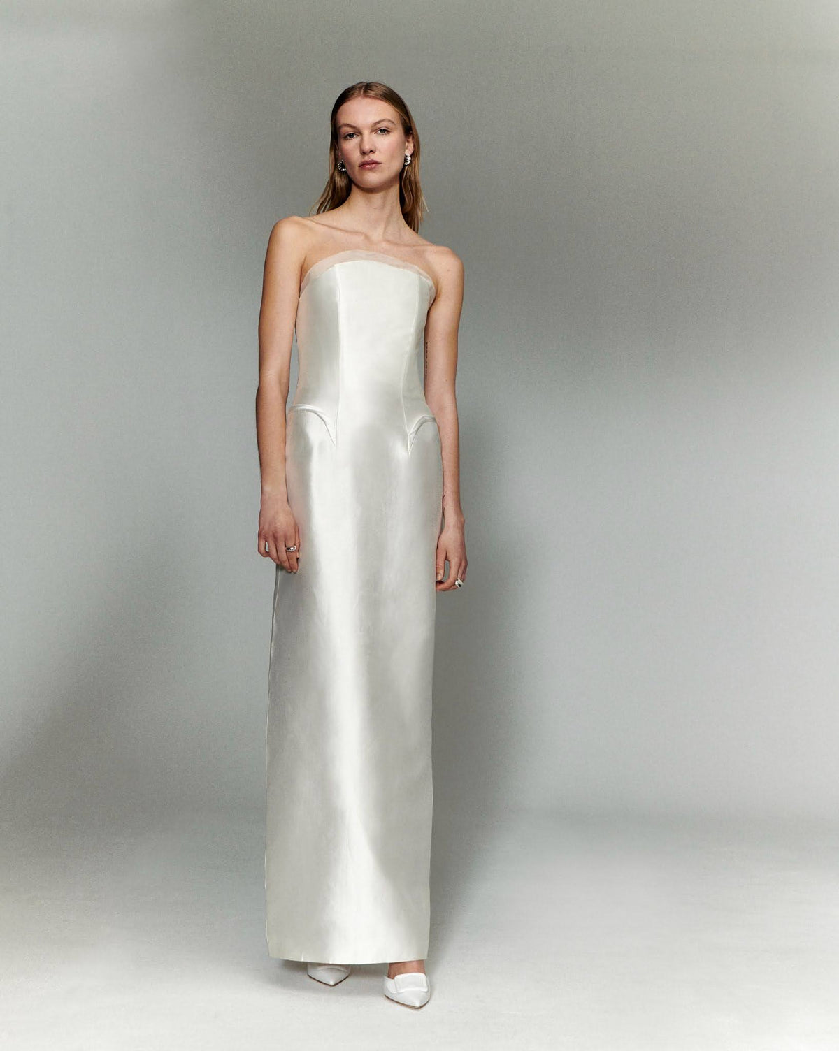 Handmade at its London atelier, The OWN Studio’s signature style combines pared-back, contemporary silhouettes with unexpected vintage details resulting in considered, minimal styles for the modern woman. The label brings a fresh and contemporary approach to wedding and evening wear. The elevated crescent shaped neckline on the Crescent Strapless Silk Mikado Gown | STYLE 118 is edged with silk organza and is echoed in the silk pocket detail just below the waist. Fully corseted for additional support and structure, this is a minimalist silhouette crafted in signature silk mikado fabric that is completely effortless. Pair with silk chiffon and organza cape for a refined bridal look.