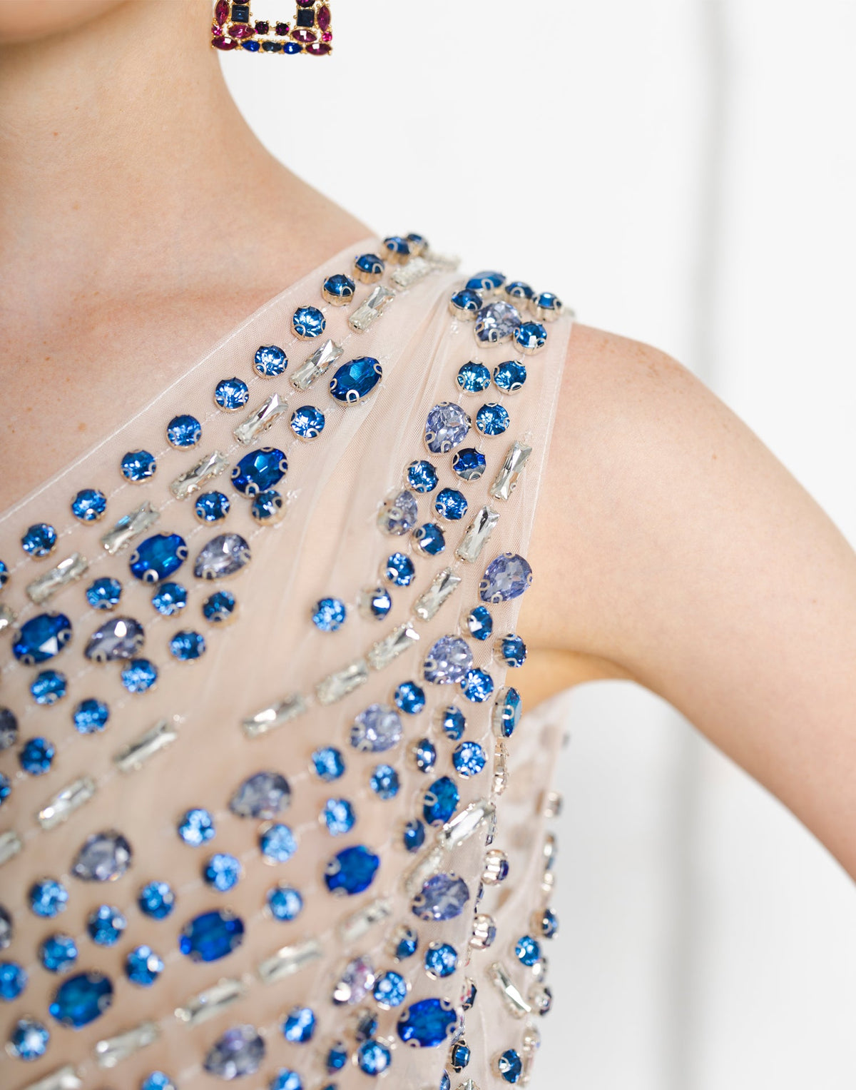 Founded by design duo Jeffrey Taylor and Roy Carey, JEOFROI is a demi couture-minded brand based in Atlanta with standout occasion-wear at its forefront. Drip and dazzle in this asymmetrical hand-embroidered mini frock. Aquamarine sapphire and azure take the main stage with over 2,000 hand placed crystal elements. Adored and adorned with an invisible closure, the Crystal Drip Frock dress will ensure that all eyes are on you.