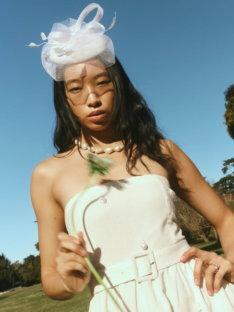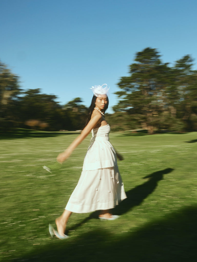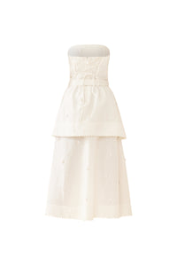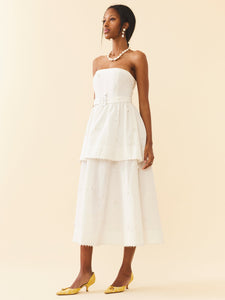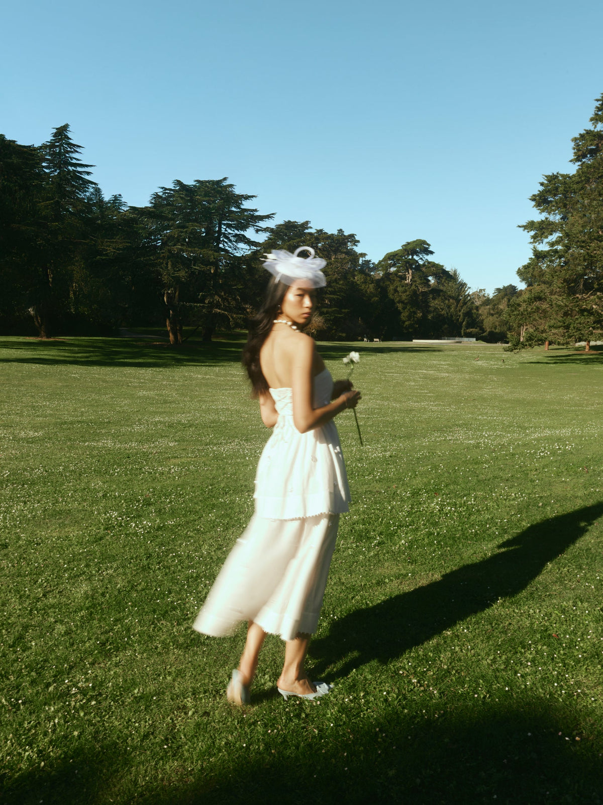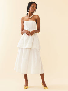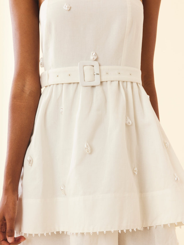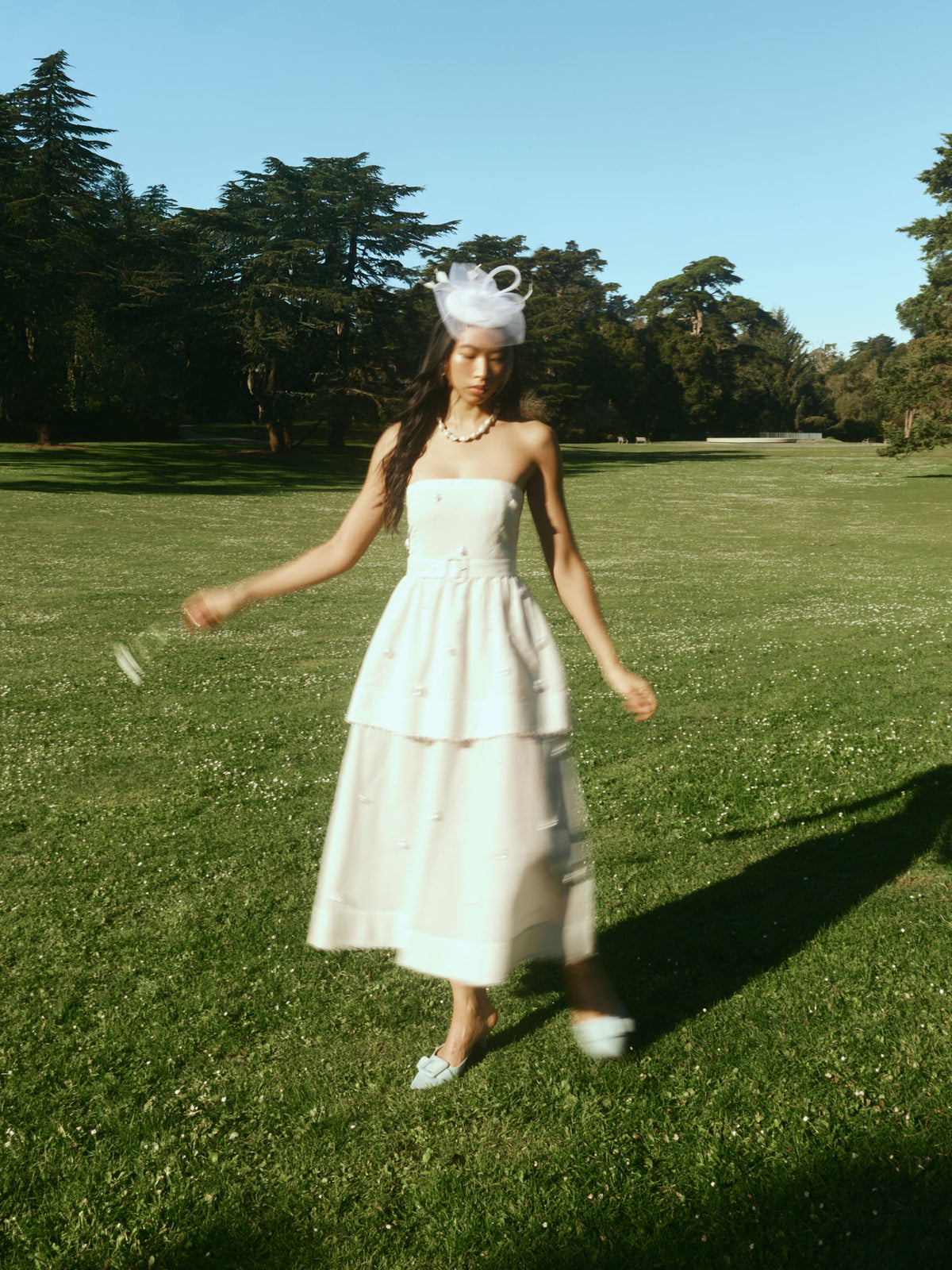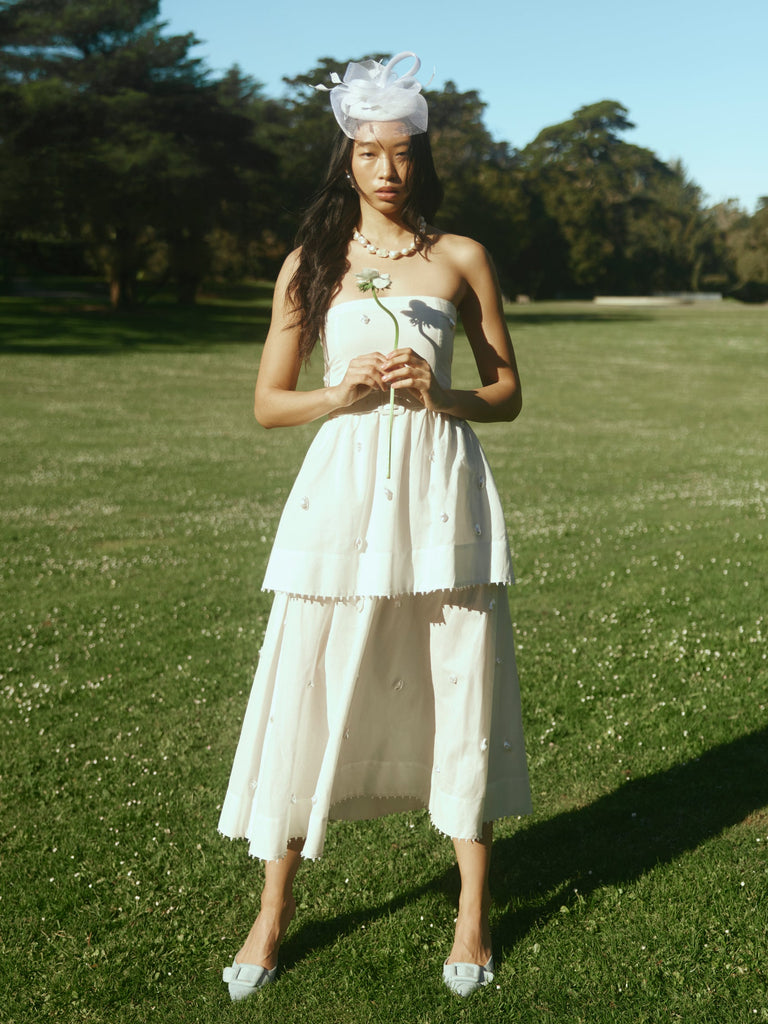 Tomboy looks, girly-girl styles, and an always fashionable approach define Eddy’s aesthetic. With a focus on bold and feminine silhouettes, Eddy dresses and tops pair elevated California bohemian with global inspiration; these are clothes designed to make you feel good inside and out. OTM Exclusive: Emma Dress in Pearly White is a strapless midi dress ready for any party. Tiered layers combine with a smocked back, zipper closure, and belted waist for a comfortable yet sophisticated fit. Baroque pearls and hems lined with traditional pearl beads create elevated elegance.