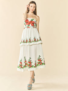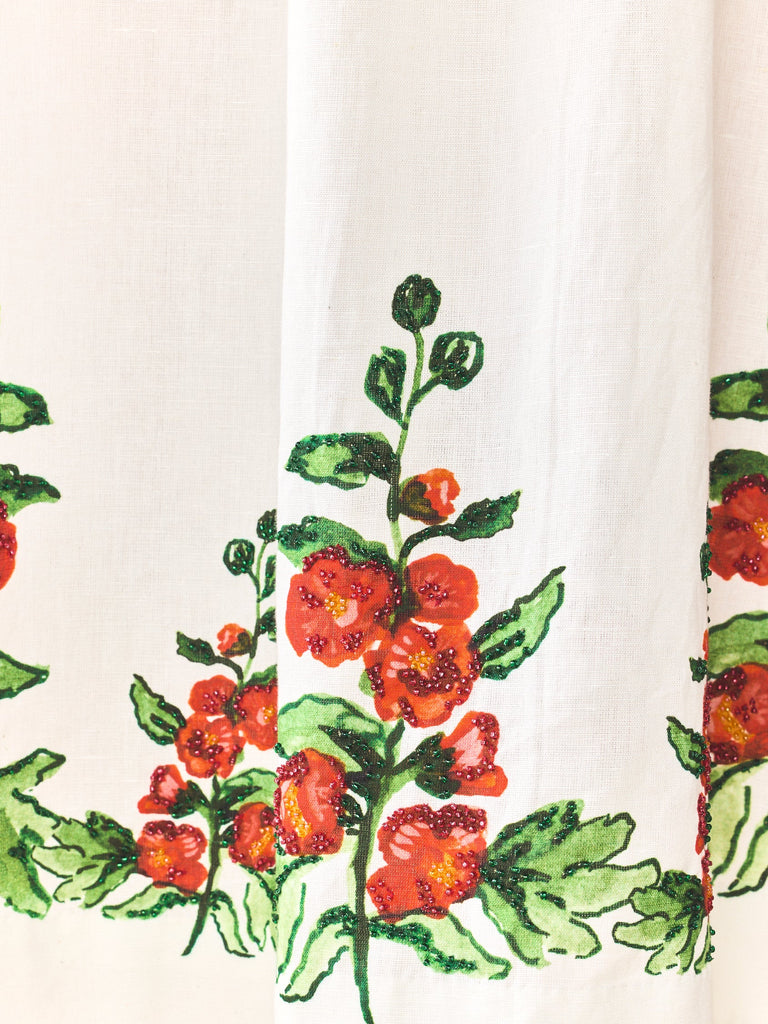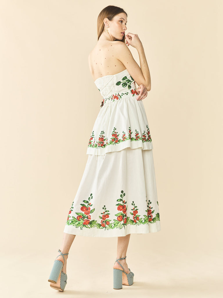 70% cotton, 30% linen. Decorated in Larsen McDowell original artwork. Tonal bead accents. Strapless bust. Empire waist. Two tier full skirt. Smocked back & corset ties for support. Made in India.