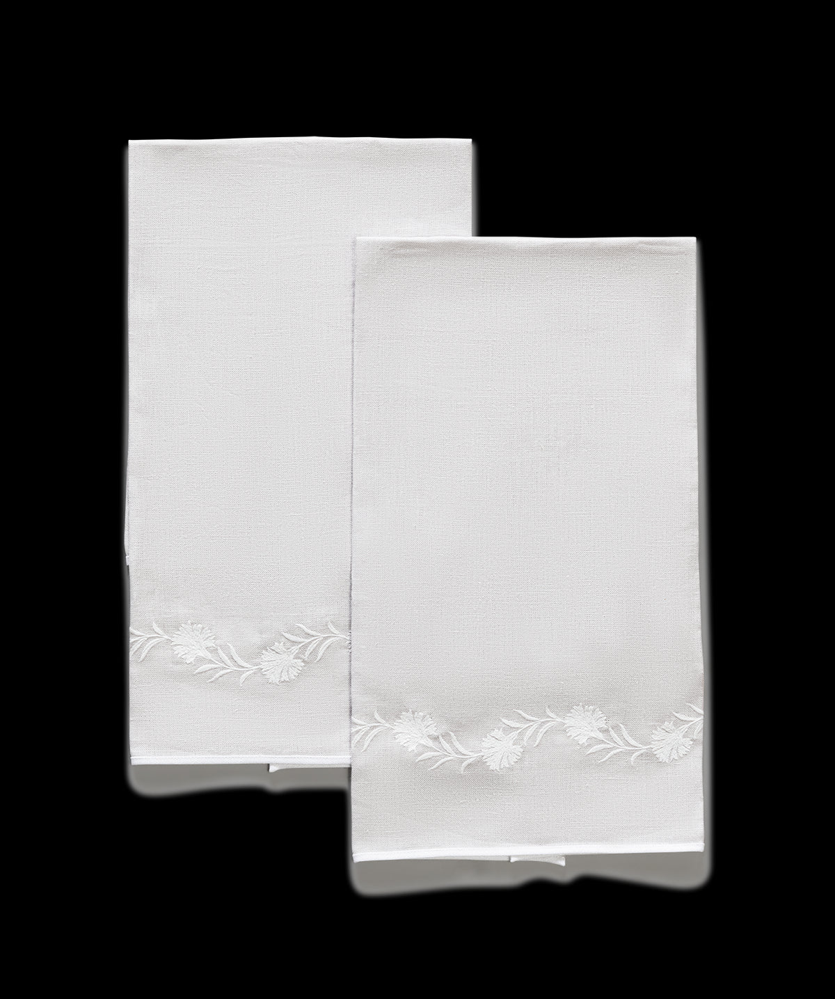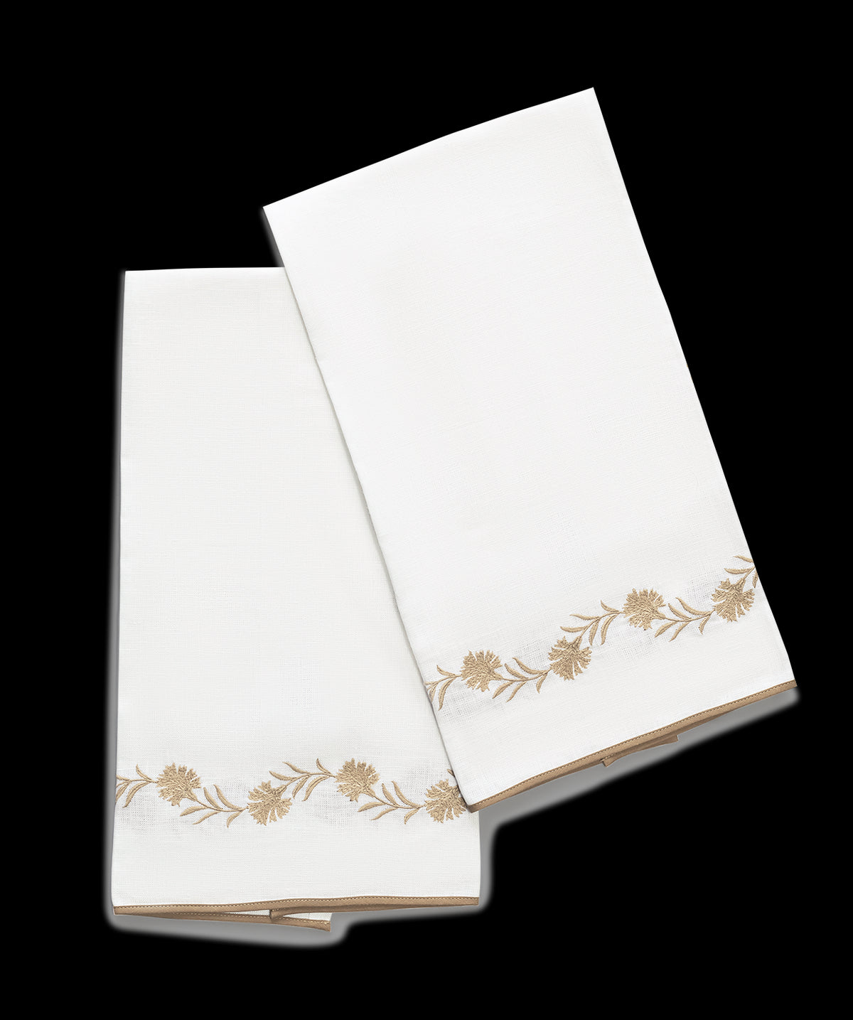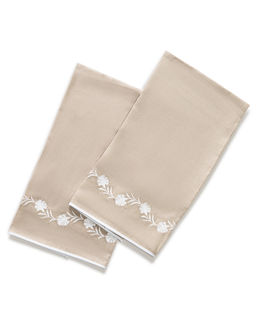 For nearly 100 years and three generations, Matouk has handcrafted luxury linens from the world’s finest materials. Their dedicated artisans in Fall River, Massachusetts are committed to creating the highest quality, most-loved bed, bath, and table linens for your home. Embroidered with a trailing floral motif and crafted in luxurious linen, the Daphne Guest Towels, Set of 2 adds delicate charm to any bathroom.