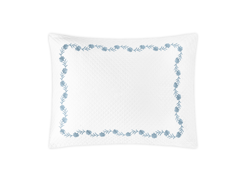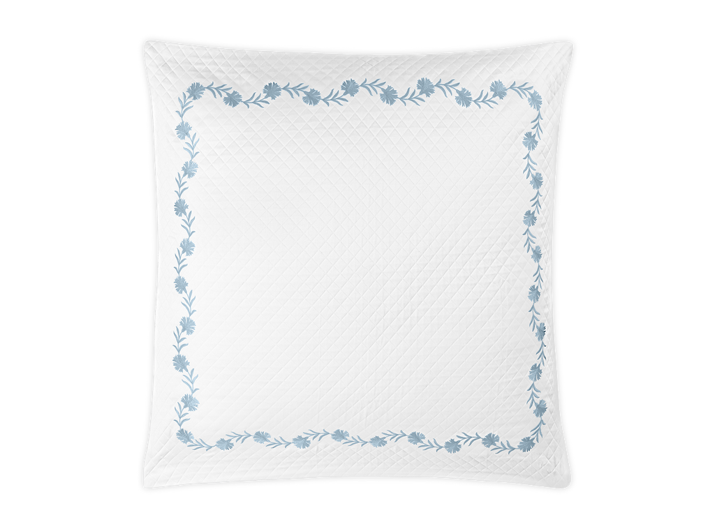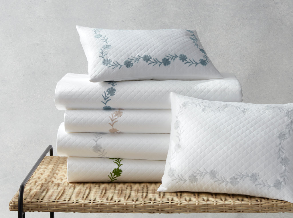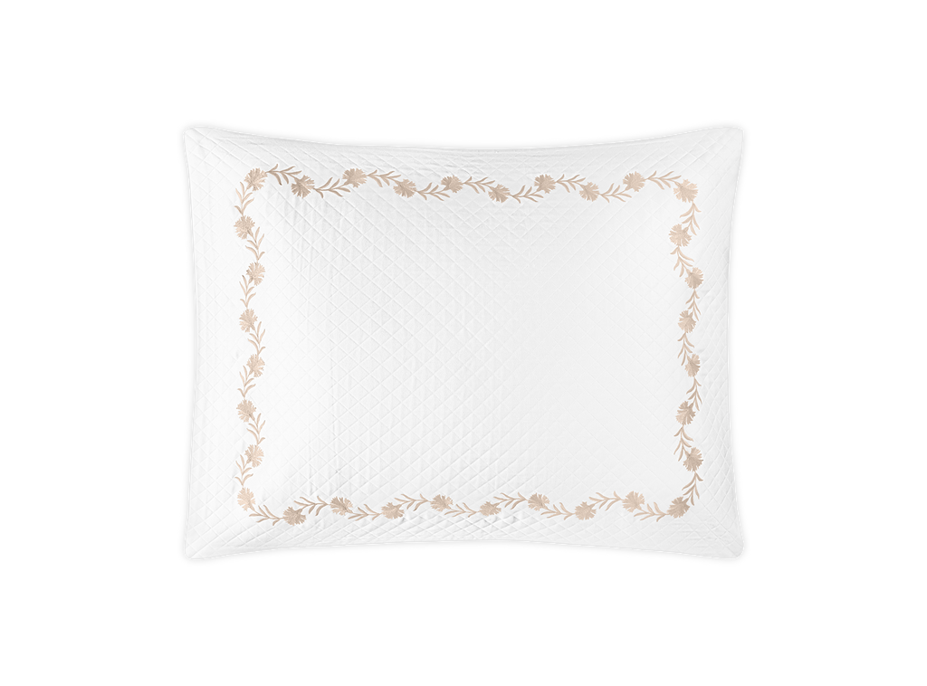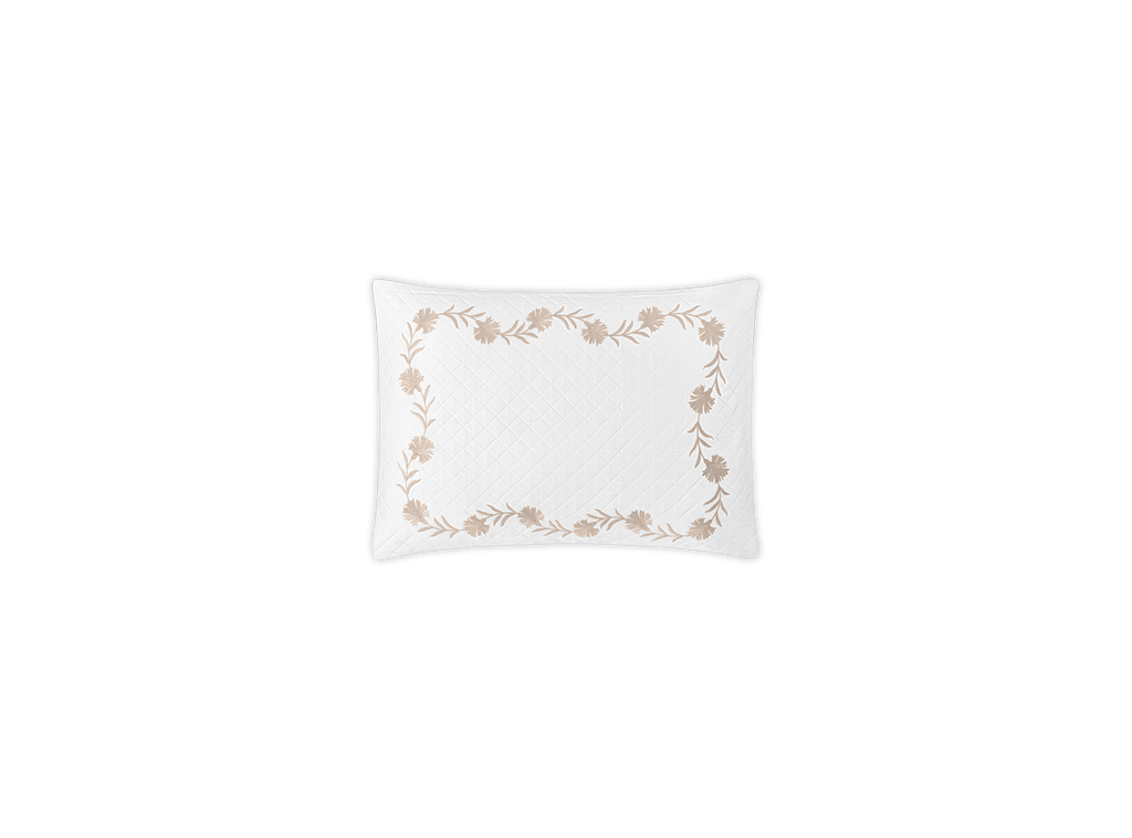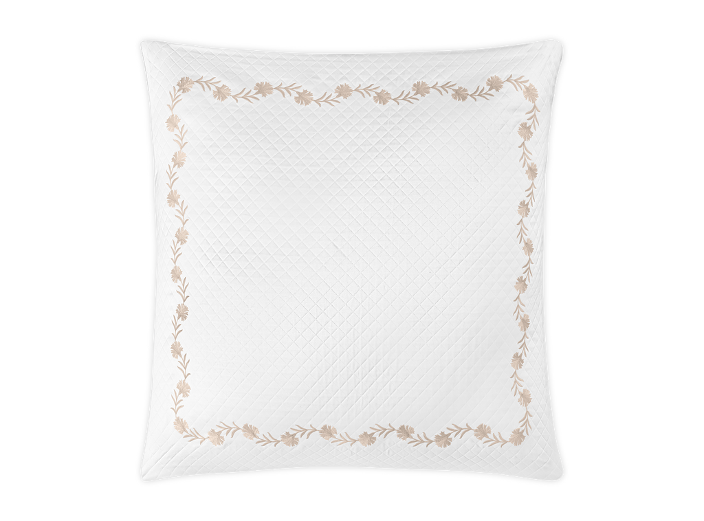 With its softly sculpted floral embroidery, the Daphne Matelassé Sham brings a delicate, dimensional elegance to the bed. Set against the refined texture of Petra diamond matelassé, it offers a gentle sheen and fluid drape that pairs beautifully with the beloved Daphne sheeting collection.