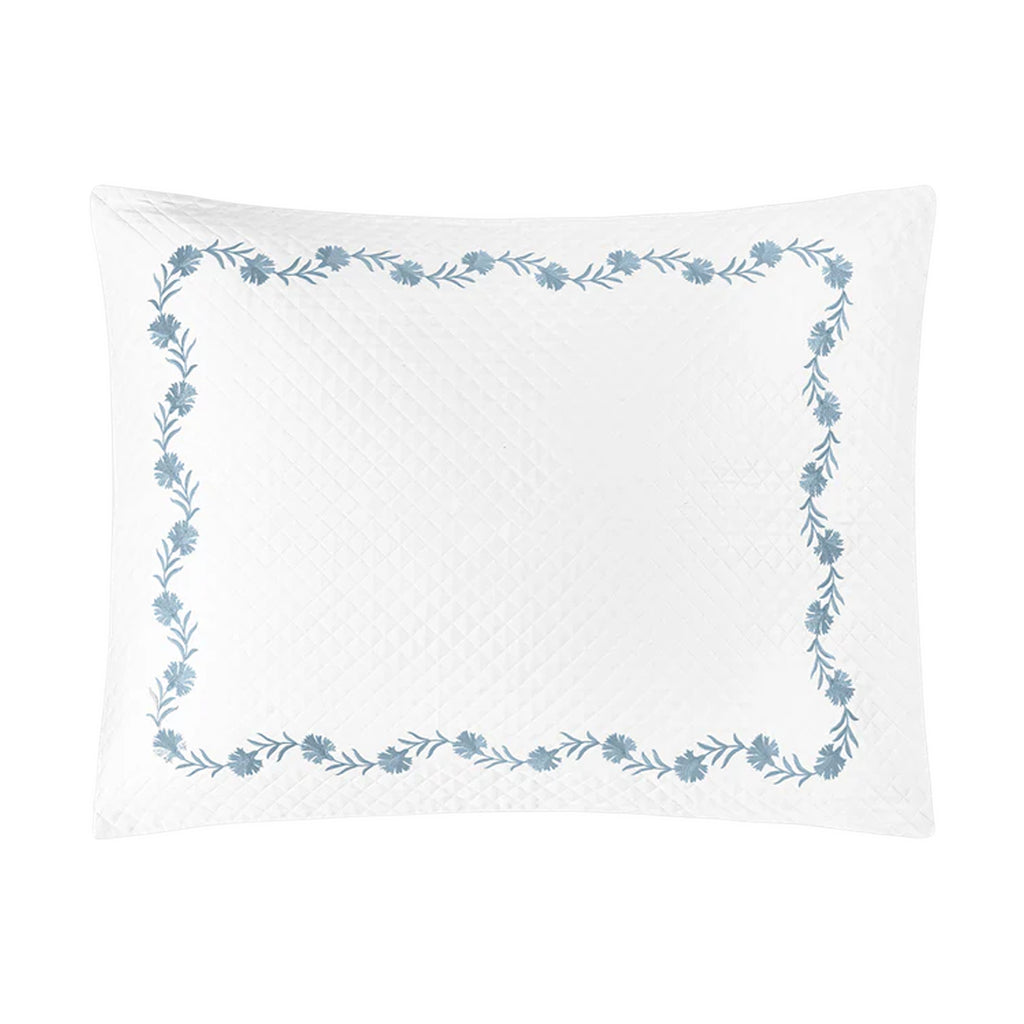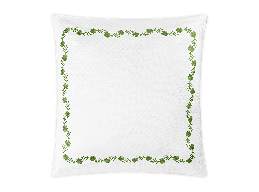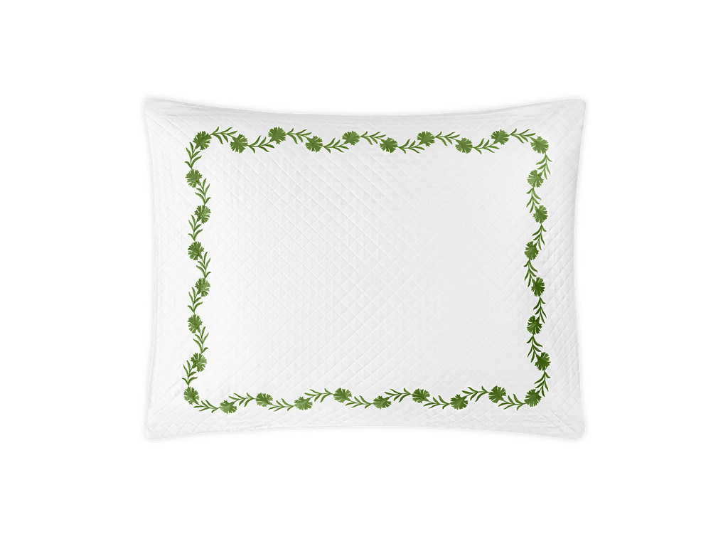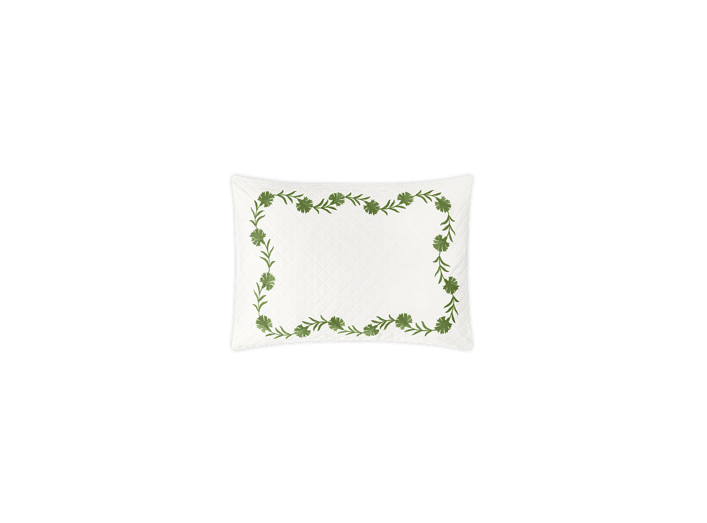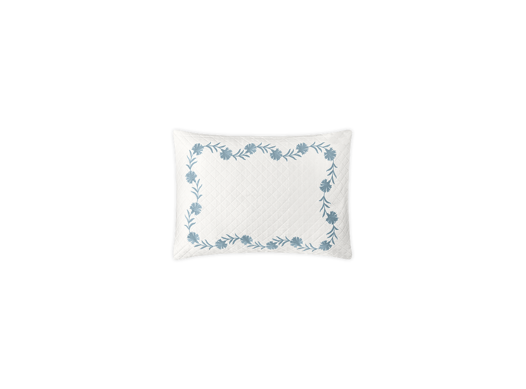 With its softly sculpted floral embroidery, the Daphne Matelassé Sham brings a delicate, dimensional elegance to the bed. Set against the refined texture of Petra diamond matelassé, it offers a gentle sheen and fluid drape that pairs beautifully with the beloved Daphne sheeting collection.