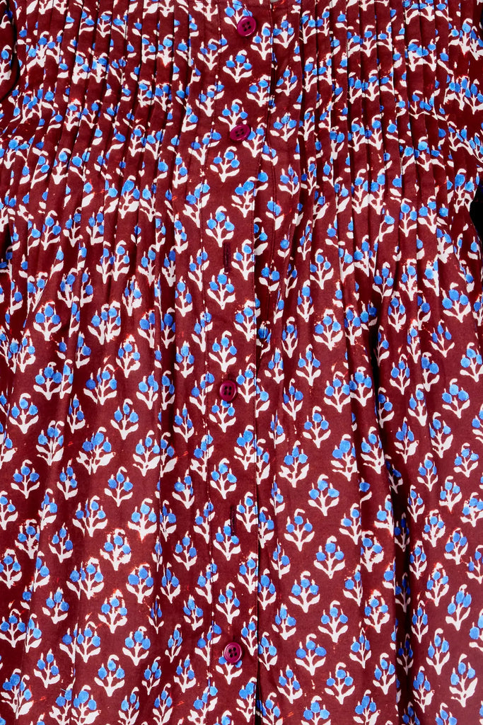100% cotton voile. Pintuck detailing. Crew neckline. Long full sleeves. Button-front closure.