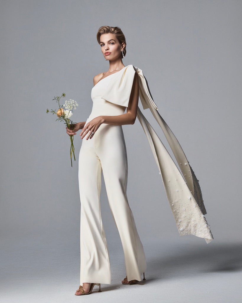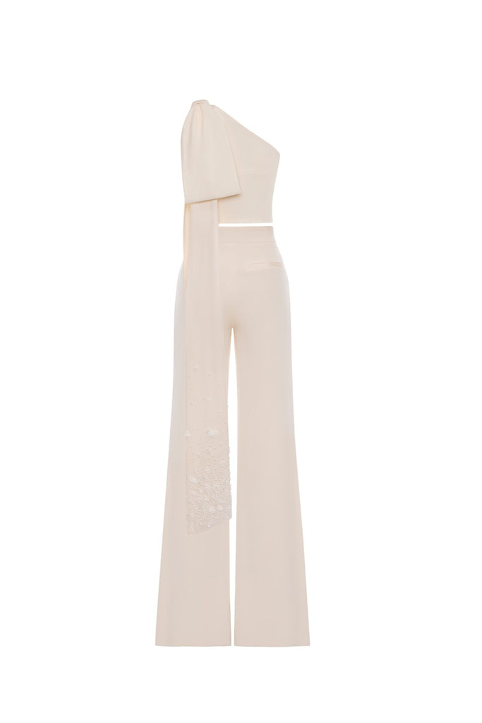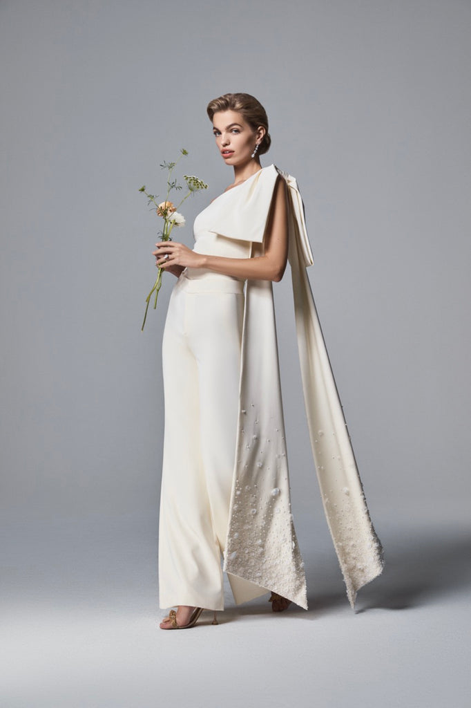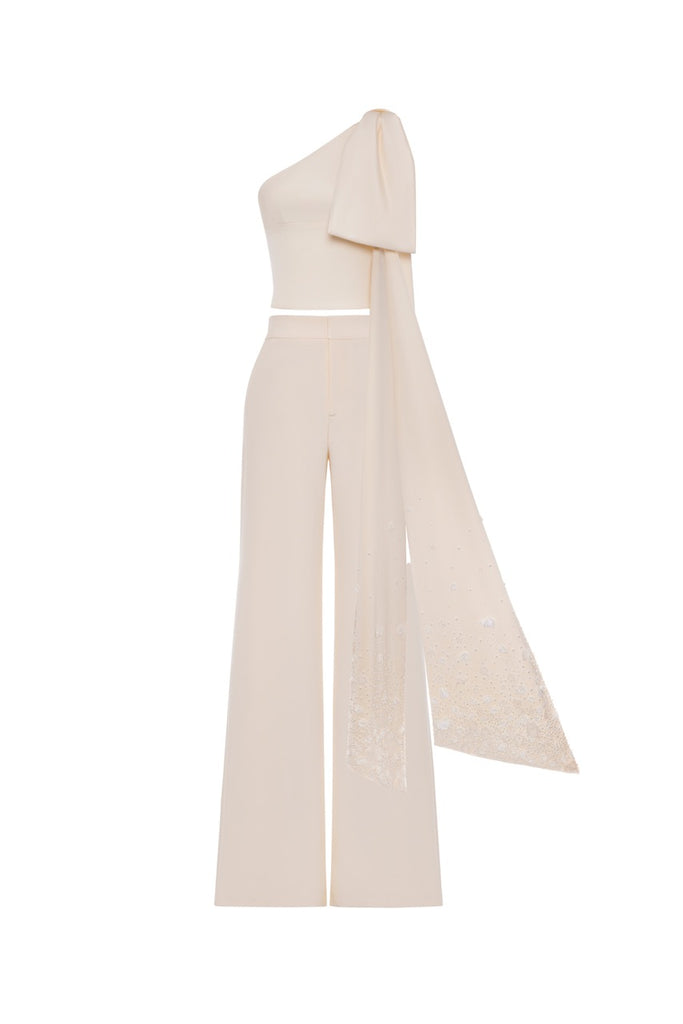 Born in India and raised in New York, where she eventually worked in finance, Natasha Das’s diverse background is at the essence of Danarys New York, a luxury womenswear label that asks its wearer to embrace their strength and fearlessness of their femininity. Topped with a cream-colored bow hand-embellished with pearls and flowers, the Dasha Top features an asymmetrical one-shoulder silhouette that pairs beautifully with the Veronique Pants for a modern bridal look. The Veronique Pants, designed in luxurious off-white silk crepe, offer a refined, elongated silhouette that embodies quiet sophistication—ideal for the contemporary bride.