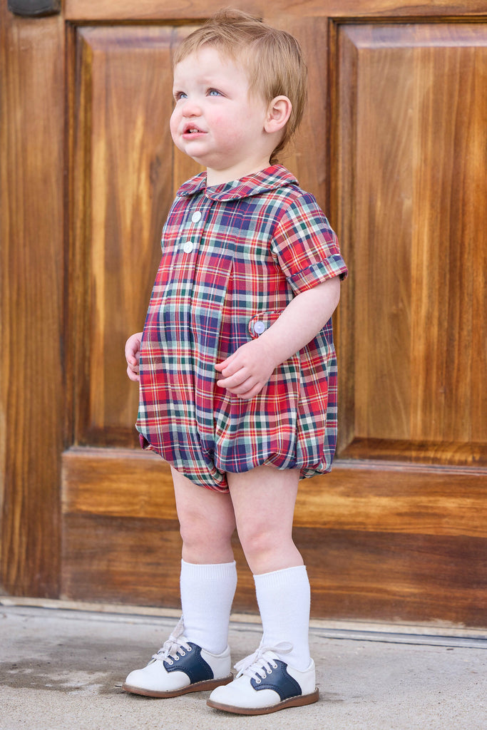 Shannon Latham founded Little English in 2004 with the belief that children should always be well-dressed. Employing hand-smocking, hand-embroidery, and the very best fabrics, Shannon and her daughter design timeless pieces that will be worn for generations to come. Meet Middleburg, a rich plaid in deep red, navy, and hunter green that pairs beautifully with classic navy pieces. With a nod to vintage school prep, this collection is quintessential fall at its finest. The Davant Bubble in Middleburg Plaid features button tabs, tonal piping, and darted pleats at the front, making it a timeless style for baby boys. Pair with the Crochet Cardigan – Wagoneer for added charm, and coordinate with sibling pieces from the Middleburg Collection for memorable family photos and holiday celebrations.