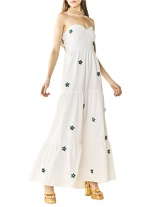 Tomboy looks, girly-girl styles, and an always fashionable approach define EDDY’s aesthetic. With a focus on bold and feminine silhouettes, EDDY dresses and tops pair elevated California bohemian with global inspiration; these are clothes designed to make you feel good inside and out. The Days Gown in White with Painted Beads is crafted from a breathable cotton-linen blend and designed with a strapless silhouette and sweetheart neckline. Hand-placed painted beaded florals bring texture and artisanal charm to its tiered, full-length form—made to float through warm days and golden-hour gatherings alike.