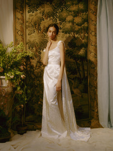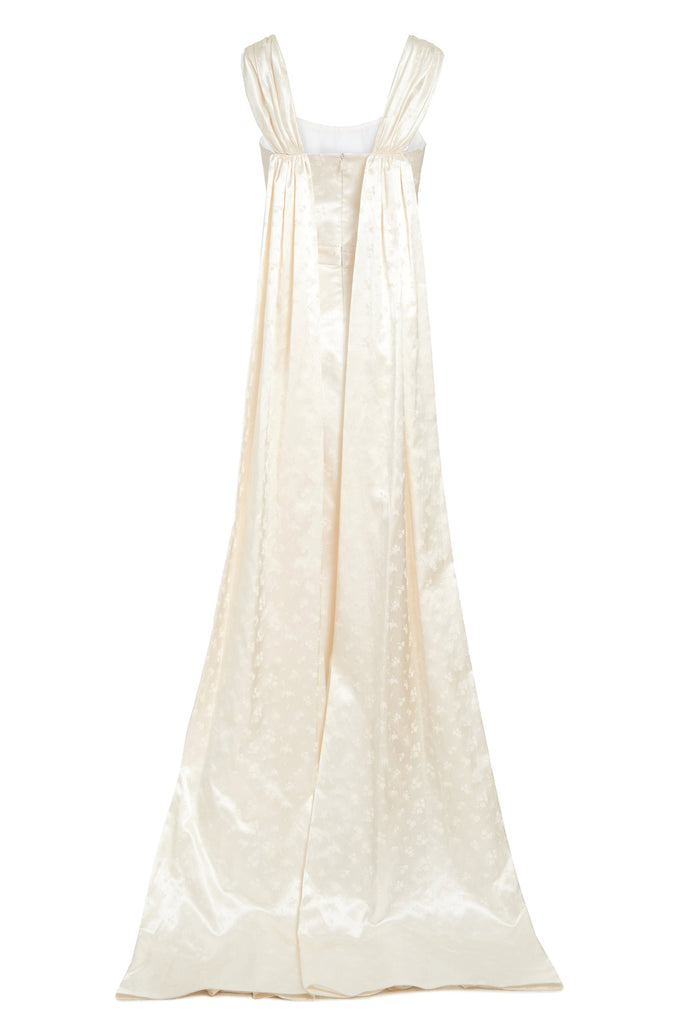 Named after a particularly radiant group of galaxies, Markarian combines designer Alexandra O’Neill’s love of the cosmos and celestial romanticism with timeless design and modern silhouettes. A forward-thinking approach to fashion and a focus on fine craftsmanship mean Markarian is beautiful, well-made, and flattering. The White Floral Ditsy Print Gown with Shoulder Strap Trains features an elegant scoop neckline, corset bodice, and stunning train that extends from each shoulder.