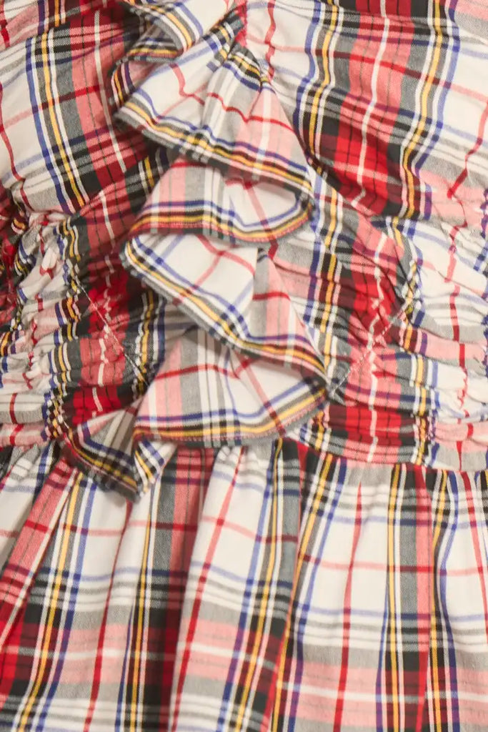 Cotton blend in Carlyle Plaid. Fitted V-neckline. Cascading ruffles. Shirred detailing. Peplum waist. Sleeveless silhouette. Concealed back zipper. Fully lined.
